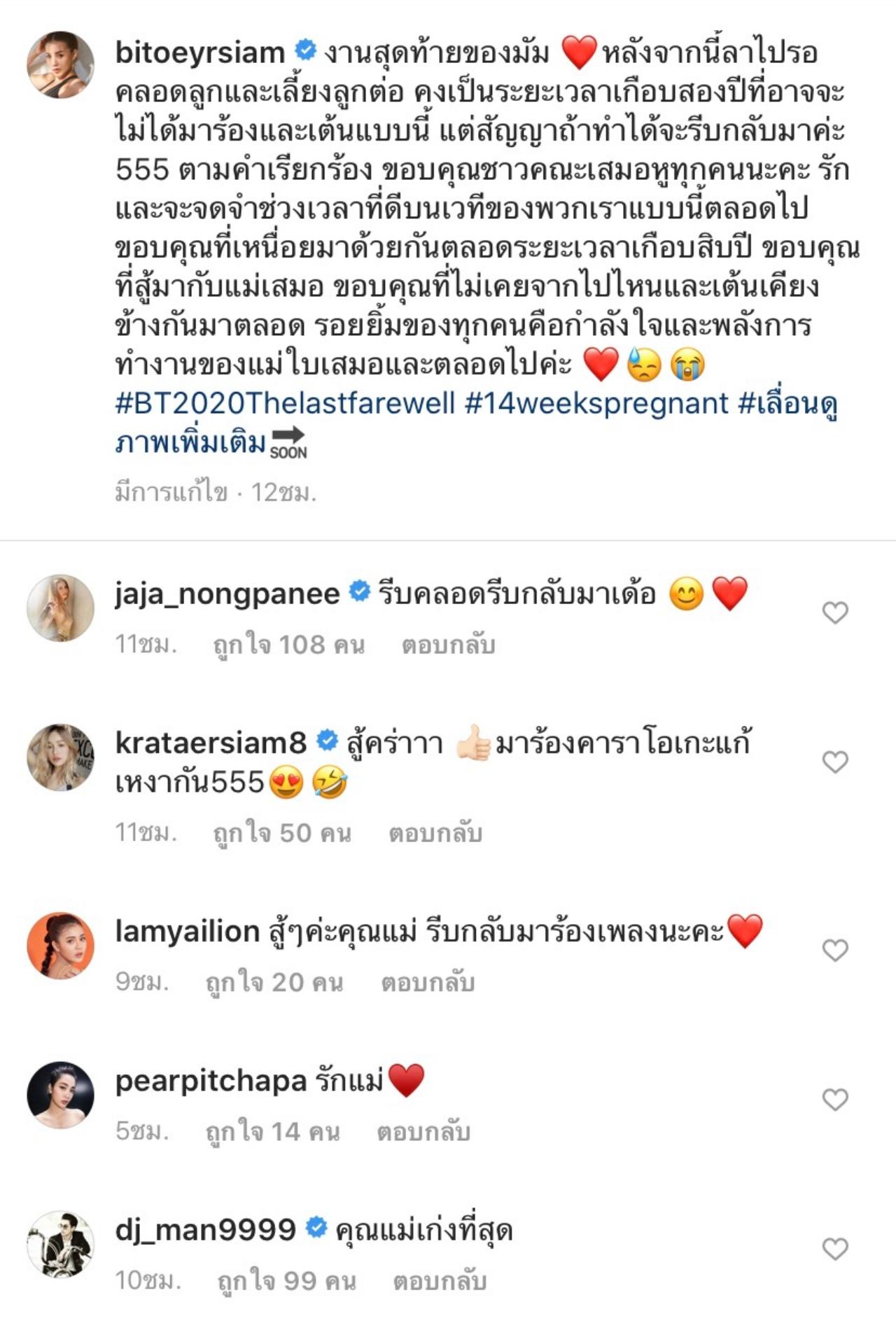 “งานสุดท้ายของมัม หลังจากนี้รอไปคลอดลูกและเลี้ยงลูกต่อ คงเป็นระยะเวลาเกือบสองปีที่อาจจะไม่ได้มาร้องเพลงและเต้นแบบนี้ แต่สัญญาถ้าทำได้จะรีบกลับมาค่ะ 555 ตามคำเรียกร้อง ขอบคุณชาวคณะเสมอหูทุกคนนะคะ รักและจะจดจำช่วงเวลาที่ดีบนเวทีของพวกเราแบบนี้ตลอดไป