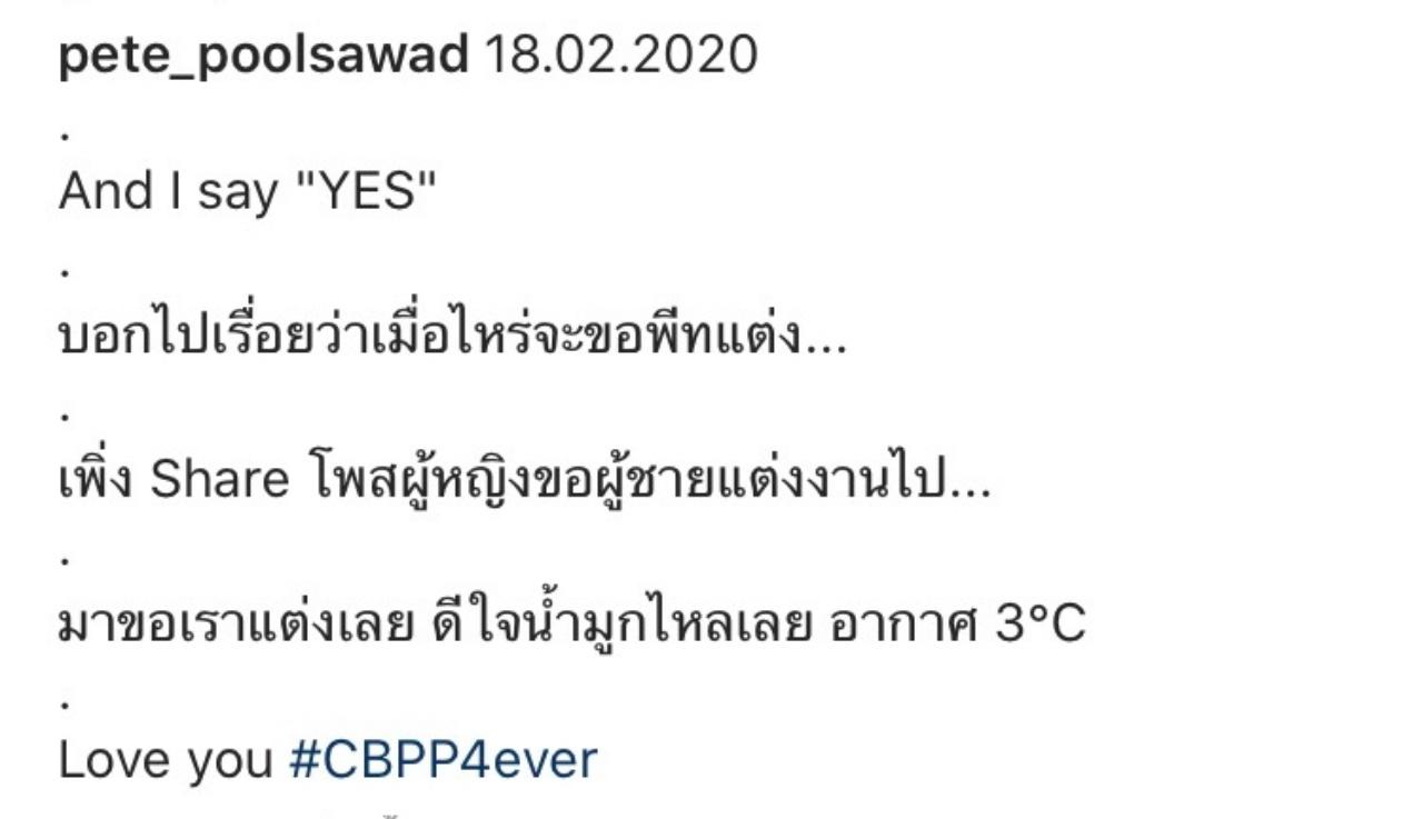 และทางด้าน พีท ก็ได้โพสต์ภาพพร้อมกับเขียนข้อความสุดหวานถึงแฟนสาวว่า "18.02.2020 And I say "YES" บอกไปเรื่อยว่าเมื่อไหร่จะขอพีทแต่ง เพิ่ง Share โพสผู้หญิงขอผู้ชายแต่งงานไป มาขอเราแต่งเลย ดีใจน้ำมูกไหลเลย อากาศ 3°C Love you #CBPP4ever"