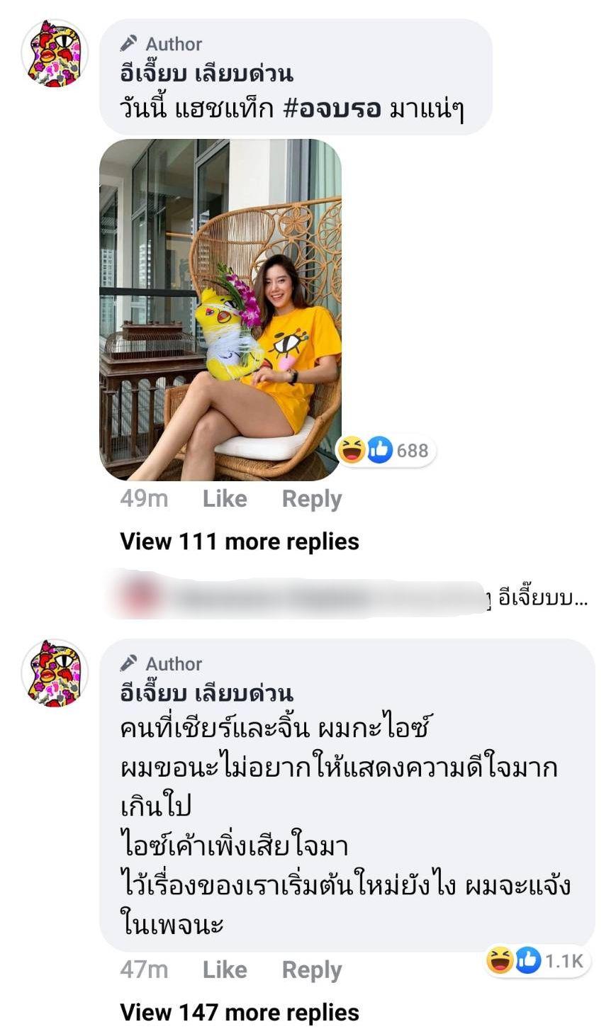 นอกจากนี้ อีเจี๊ยบ เลียบด่วน ยังโพสต์ในคอมเมนต์ใต้ภาพอีกว่า “วันนี้ แฮชแท็ก #อจบรอ มาแน่ๆ” และบอกอีกว่า “คนที่เชียร์และจิ้น ผมกะไอซ์ ผมขอนะไม่อยากให้แสดงความดีใจมากเกินใป ไอซ์เค้าเพิ่งเสียใจมา ไว้เรื่องของเราเริ่มต้นใหม่ยังไง ผมจะแจ้งในเพจนะ”