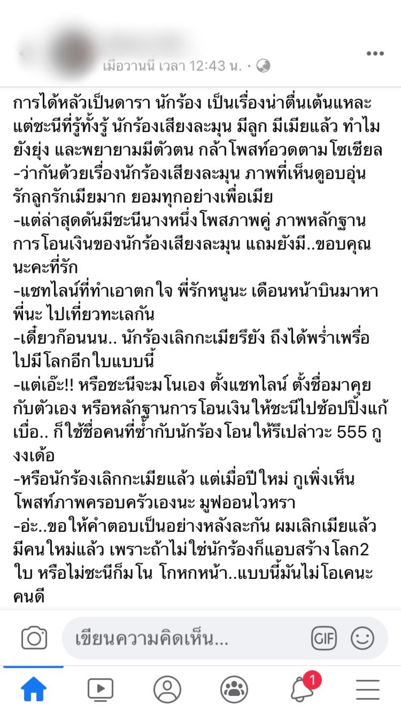 "คือประเด็นของพี่ พี่เองพี่งงตอนแรกมีเพจหนึ่งตั้งกระทู้ขึ้นมาในเรื่องของนักร้องเสียงละมุนแอบมีเมียน้อย มีการเอาบัญชีโอนเงินให้ผู้หญิงคนหนึ่ง ซึ่งก็ไปเอาภาพมาจากเฟซบุ๊กของผู้หญิงท่านนี้