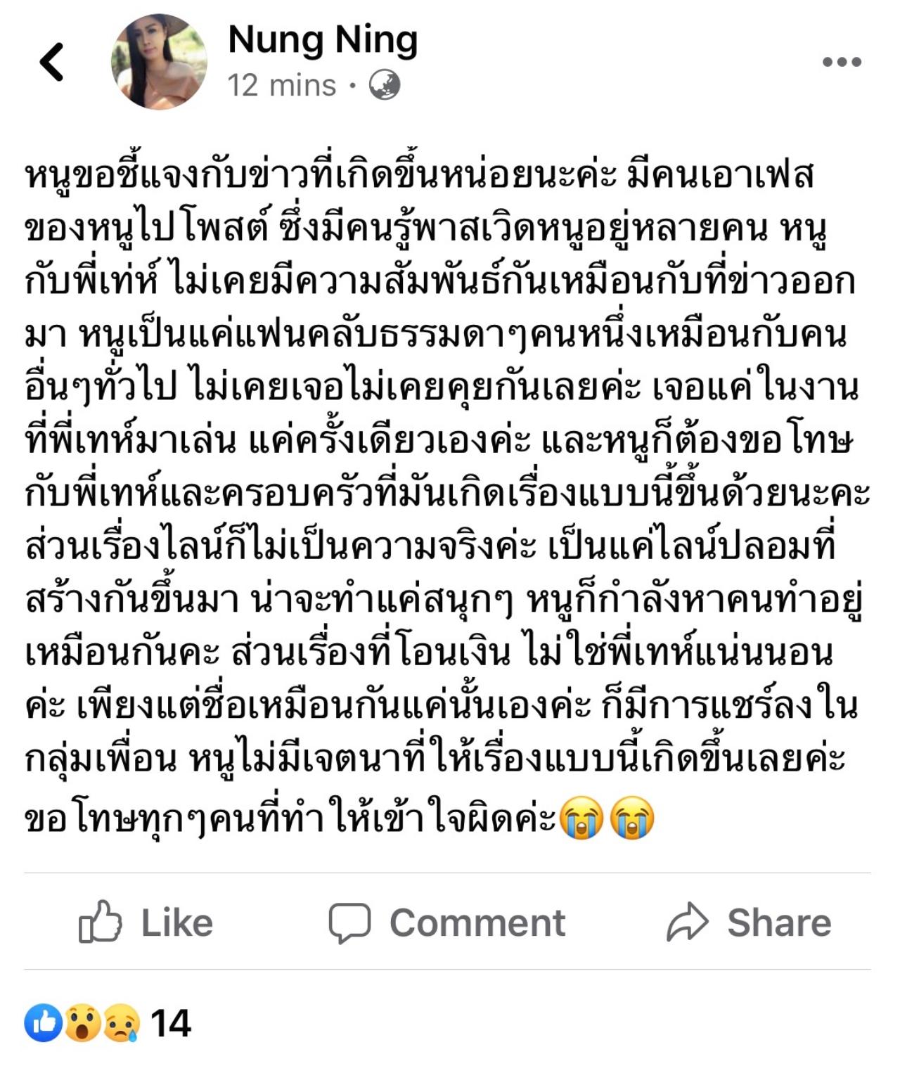 “ค่ะ หนูก็ต้องขอโทษที่ทำให้เรื่องแบบนี้เกิดขึ้นค่ะ ทั้งพี่เท่ห์และก็ภรรยาของเค้า หนูไม่มีเจตนาจะให้มันเกิดเรื่องแบบนี้ขึ้นจริงๆ ค่ะ ส่วนคนอื่นที่เข้าใจผิด หนูก็ไม่รู้จะพูดยังไงค่ะ เพราะเค้าคิดแบบนั้นอยู่แล้วค่ะ ไม่อยากจะฝากบอกอะไรถึงเค้าค่ะ”