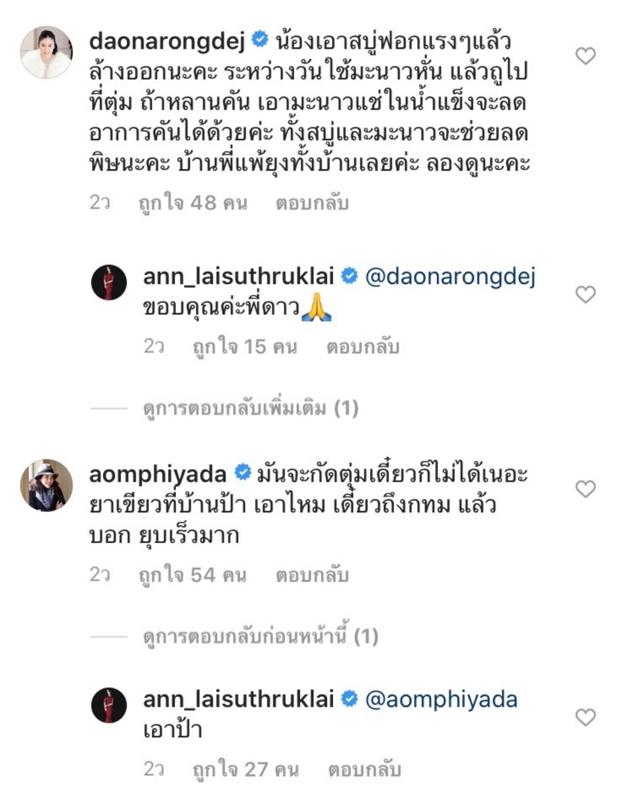 โดย แอน อลิชา ได้โพสต์ภาพใบหน้าของ น้องริชา ที่มีรอยตุ่มแดงจากยุงกัดแก้มเต็มไปหมด พร้อมกับซากยุงที่ถูกตบจนแบนบนฝ่ามือแม่ และได้เขียนแคปชั่นว่า