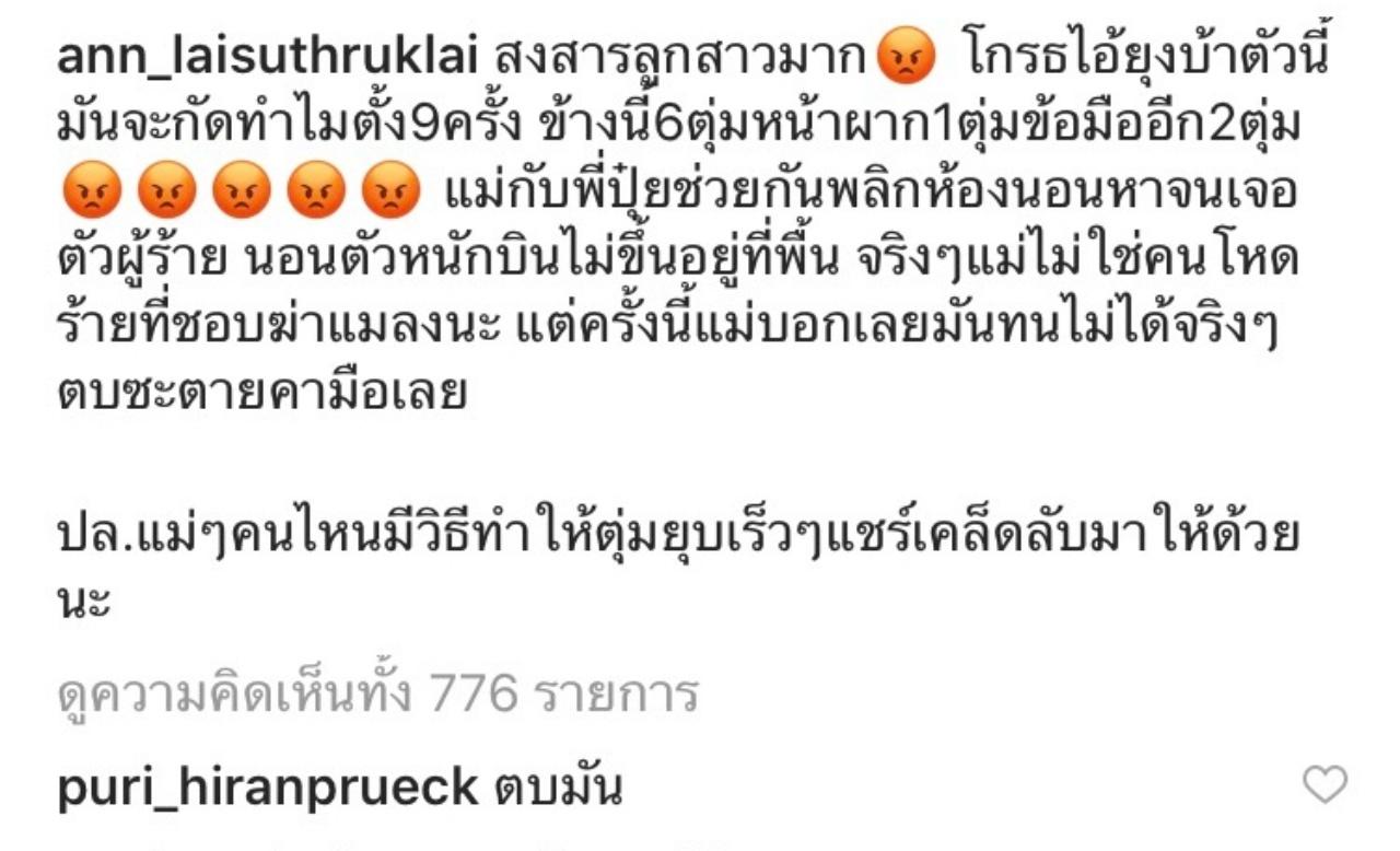 "สงสารลูกสาวมาก โกรธไอ้ยุงบ้าตัวนี้มันจะกัดทำไมตั้ง 9 ครั้ง ข้างนี้ 6 ตุ่ม หน้าผาก 1 ตุ่ม ข้อมืออีก 2 ตุ่ม แม่กับพี่ปุ๋ยช่วยกันพลิกห้องนอนหาจนเจอตัวผู้ร้าย นอนตัวหนักบินไม่ขึ้นอยู่ที่พื้น จริงๆ แม่ไม่ใช่คนโหดร้ายที่ชอบฆ่าแมลงนะ แต่ครั้งนี้แม่บอกเลย มันทนไม่ได้จริงๆ ตบซะตายคามือเลย ปล. แม่ๆ คนไหนมีวิธีทำให้ตุ่มยุบเร็วๆ แชร์เคล็ดลับมาให้ด้วยนะ"