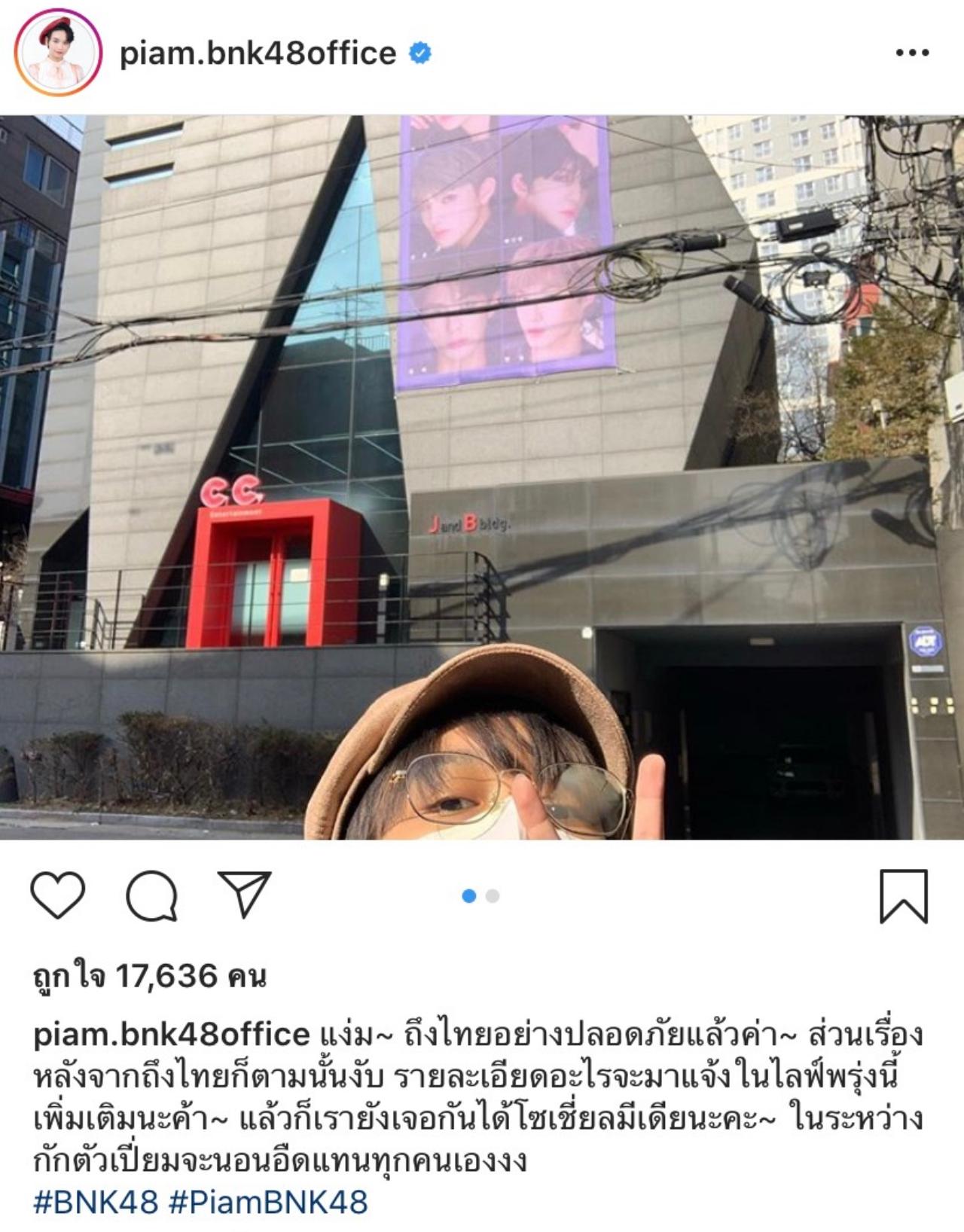 และทางไอดอลสาวก็ได้ออกมาอัปเดตในอินสตาแกรมของตัวเองเพื่อให้แฟนคลับหายเป็นห่วงพร้อมแคปชั่นว่า “แง่ม ถึงไทยอย่างปลอดภัยแล้วค่า ส่วนเรื่องหลังจากถึงไทยก็ตามนั้นงับ รายละเอียดอะไรจะมาแจ้งในไลฟ์พรุ่งนี้เพิ่มเติมนะค้า แล้วก็เรายังเจอกันได้โซเชี่ยลมีเดียนะคะ ในระหว่างกักตัวเปี่ยมจะนอนอืดแทนทุกคนเองงง #BNK48 #PiamBNK48”