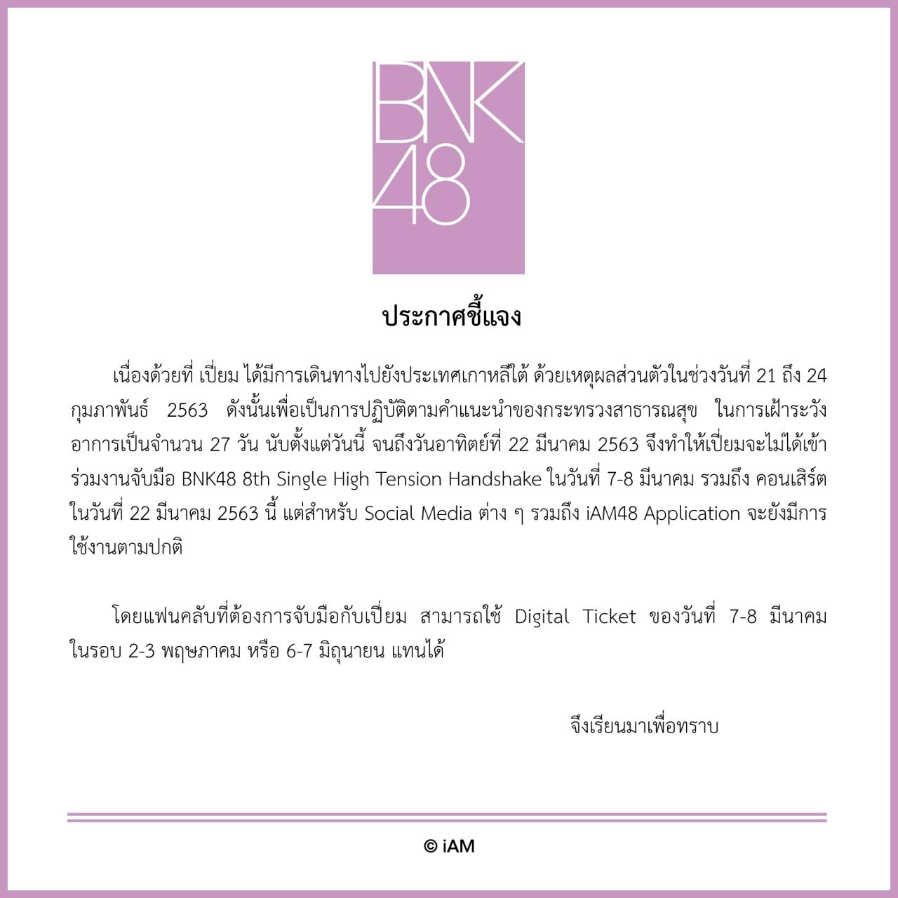 จึงทำให้เปี่ยมจะไม่ได้เข้าร่วมงานจับมือ BNK48 8th Single High Tension Handshake ในวันที่ 7-8 มีนาคม รวมถึงคอนเสิร์ตในวันที่ 22 มีนาคม 2563 นี้ แต่สำหรับ Social Medai ต่างๆ รวมไปถึง iAM48 Application จะยังมีการใช้งานตามปกติ โดยแฟนคลับที่ต้องการจับมือกับเปี่ยม สามารถใช้ Digital Ticket ของวันที่ 7-8 มีนาคม ในรอบ 2-3 พฤษภาคม หรือ 6-7 มิถุนายน แทนได้ จึงเรียนมาเพื่อทราบ”