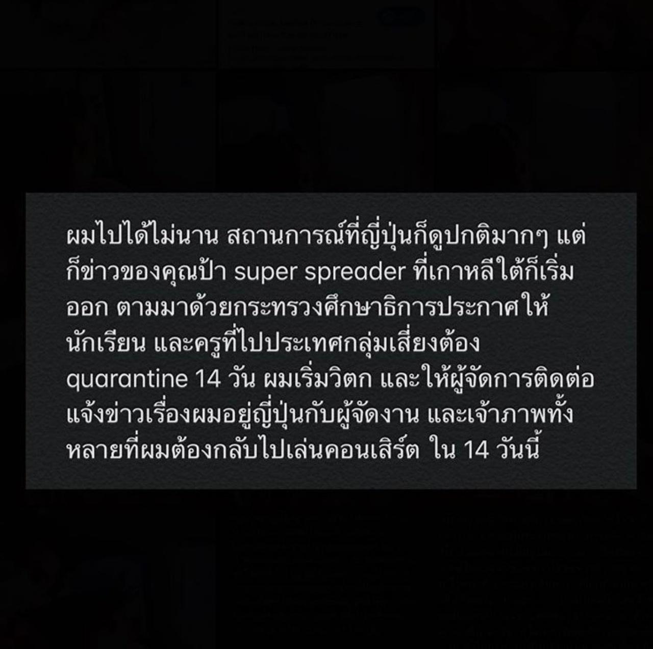 ผมไปได้ไม่นาน สถานการณ์ที่ญี่ปุ่นก็ดูปกติมากๆ แต่ก็ข่าวของคุณป้า super spreader ที่เกาหลีใต้ก็เริ่มออก ตามมาด้วยกระทรวงศึกษาธิการประกาศให้นักเรียน และครูที่ไปประเทศกลุ่มเสี่ยงต้อง quarantine 14 วัน ผมเริ่มวิตก และให้ผู้จัดการติดต่อแจ้งข่าวเรื่องผมอยู่ญี่ปุ่นกับผู้จัดงาน และเจ้าภาพทั้งหลายที่ผมต้องกลับไปเล่นคอนเสิร์ต ใน 14 วันนี้