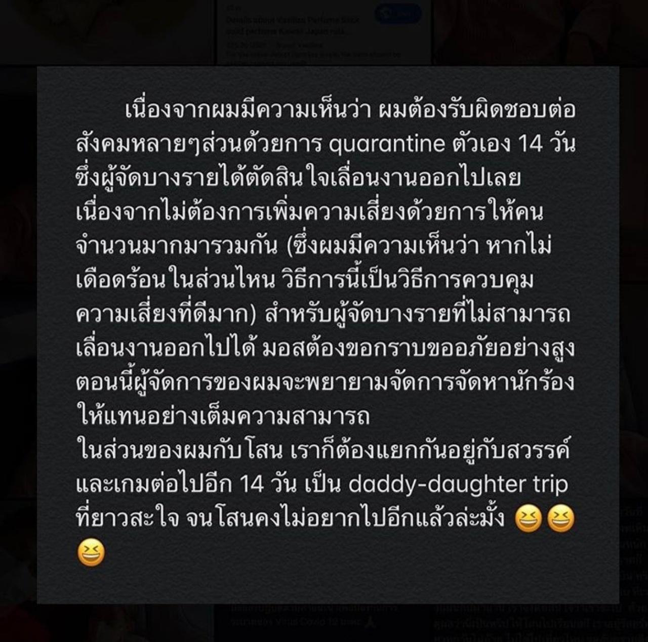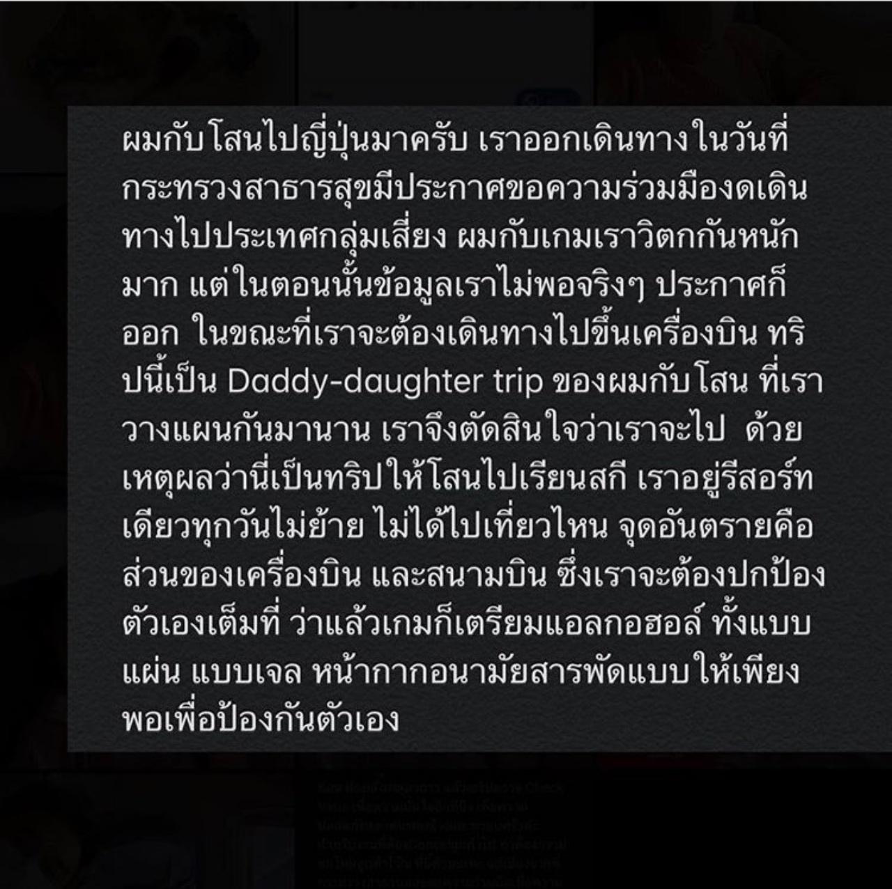 มอส ได้โพสต์อธิบายถึงเรื่องนี้ผ่านทางอินสตาแกรม เพื่อแจ้งให้ทุกคนและผู้ที่จ้างงานตนเองได้ทราบ โดยบอกว่า "ผมกับโสนไปญี่ปุ่นมาครับ เราออกเดินทางในวันที่กระทรวงสาธารณสุขมีประกาศขอความร่วมมืองดเดินทางไปประเทศกลุ่มเสี่ยง ผมกับเกมเราวิตกกันหนักมาก แต่ในตอนนั้นข้อมูลเราไม่พอจริงๆ ประกาศก็ออก ในขณะที่เราจะต้องเดินทางไปขึ้นเครื่องบิน ทริปนี้เป็น Daddy-daughter trip ของผมกับโสน ที่เราวางแผนกันมานาน เราจึงตัดสินใจว่าเราจะไป ด้วยเหตุผลว่านี่เป็นทริปให้โสนไปเรียนสกี เราอยู่รีสอร์ทเดียวทุกวันไม่ย้าย ไม่ได้ไปเที่ยวไหน จุดอันตรายคือส่วนของเครื่องบิน และสนามบิน ซึ่งเราจะต้องปกป้องตัวเองเต็มที่ ว่าแล้วเกมก็เตรียมแอลกอฮอล์ ทั้งแบบแผ่น แบบเจล หน้ากากอนามัยสารพัดแบบให้เพียงพอเพื่อป้องกันตัวเอง