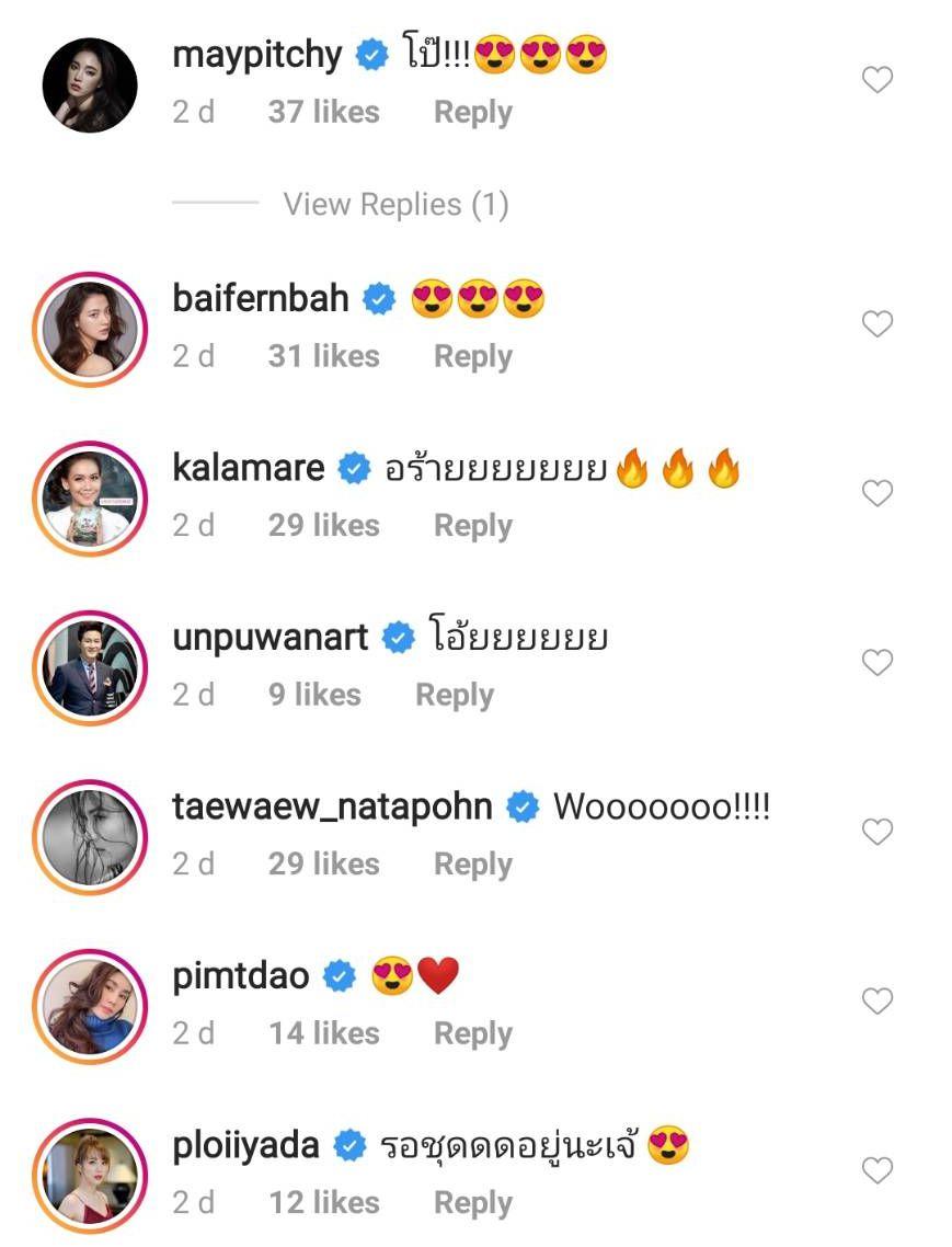 นอกจากนี้ยังมีคนในวงการบันเทิงเข้ามาแซววุ้นเส้นหลายคน อาทิ ใบเฟิร์น พิมพ์ชนก, กาละแมร์ พัชรศรี, แต้ว ณฐพร, ดาว พิมพ์ทอง, ฟลุค เกริกพล, อั๋น ภูวนาท ฯลฯ รวมไปถึงเพื่อนซี้อย่างนักแสดงสาวแซ่บ เมย์ พิชญ์นาฏ ที่แซวว่า “โป๊!!!” แถมใส่อีโมจิตาเป็นรูปหัวใจ ก็แหม...แซ่บเกินต้านใจแบบนี้ ใครๆ ก็ชอบนี่จ๊ะ อิอิ.