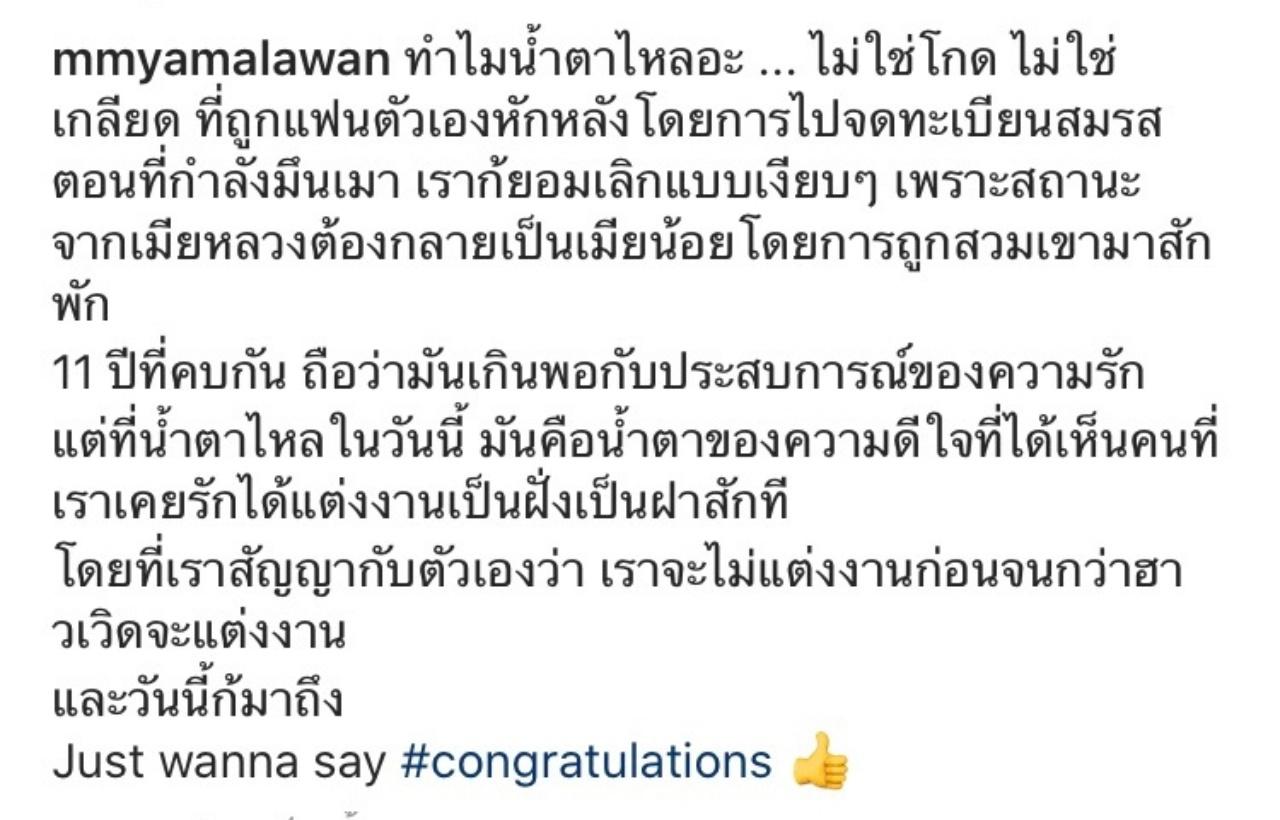 11 ปีที่คบกัน ถือว่ามันเกินพอกับประสบการณ์ของความรัก แต่ที่น้ำตาไหลในวันนี้ มันคือน้ำตาของความดีใจที่ได้เห็นคนที่เราเคยรักได้แต่งงานเป็นฝั่งเป็นฝาสักที โดยที่เราสัญญากับตัวเองว่า เราจะไม่แต่งงานก่อนจนกว่าฮาวเวิดจะแต่งงาน และวันนี้ก้มาถึง Just wanna say #congratulations"