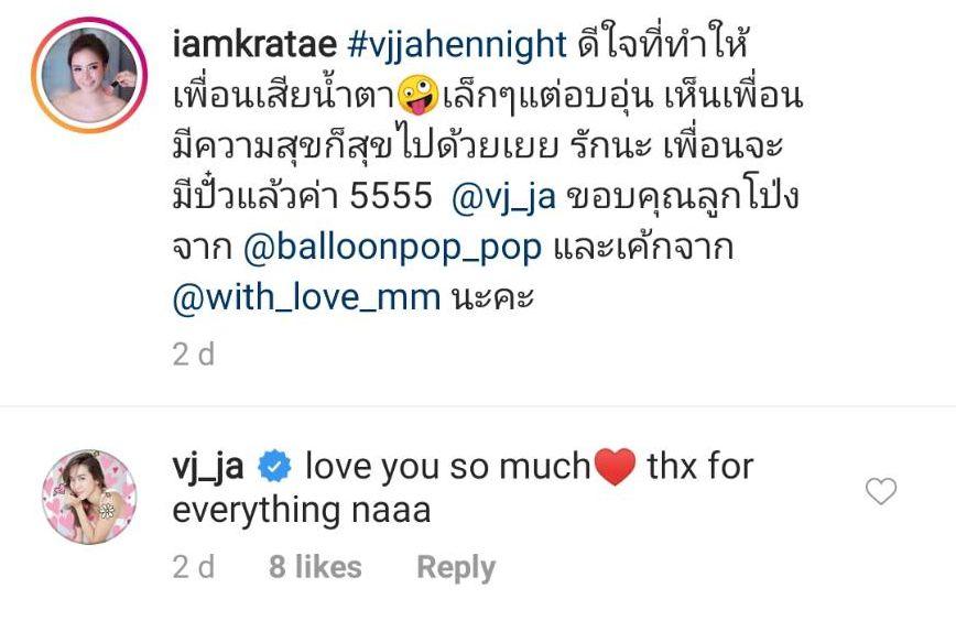 ด้านเพื่อนซี้ กระแต ศุภักษร โพสต์ภาพความประทับใจเช่นกัน พร้อมทั้งบอกว่า “#vjjahennight ดีใจที่ทำให้เพื่อนเสียน้ำตาเล็กๆ แต่อบอุ่น เห็นเพื่อนมีความสุขก็สุขไปด้วยเยย รักนะ เพื่อนจะมีปั๋วแล้วค่า 5555 @vj_ja” และ จ๋า ตอบกลับว่า “love you so much thx for everything naaa”.