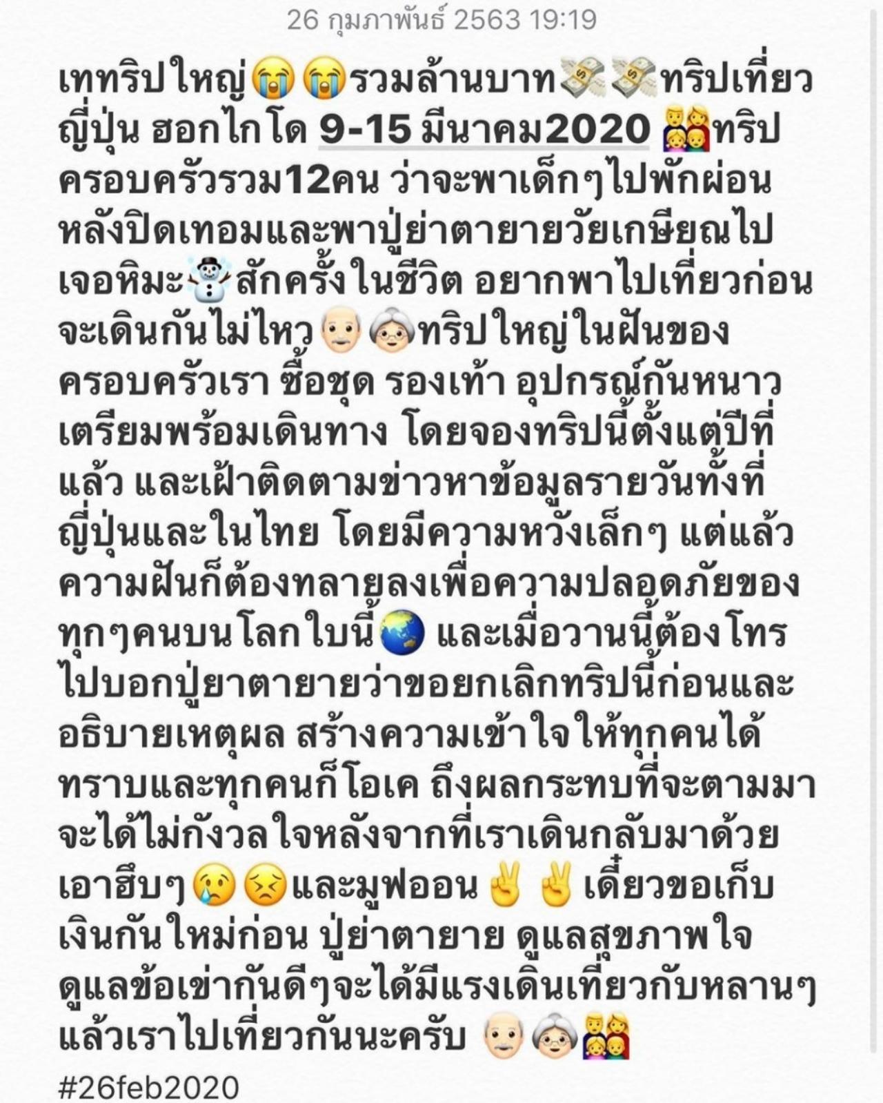 “เททริปใหญ่ รวมล้านบาท ทริปเที่ยวญี่ปุ่น ฮอกไกโด 9-15 มีนาคม 2020 ทริปครอบครัวรวม 12 คน ว่าจะพาเด็กๆ ไปพักผ่อนหลังปิดเทอมและพาปู่ย่าตายายวัยเกษียณไปเจอหิมะสักครั้งในชีวิต อยากพาไปเที่ยวก่อนจะเดินกันไม่ไหว