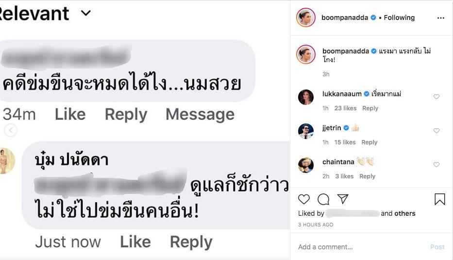 นอกจากนี้ยังมีชาวเน็ตอีกคนเข้ามาคอมเมนต์ด้วยข้อความว่า “คดีข่มขืนจะหมดได้ไง นมสวย” และ บุ๋ม ปนัดดา ก็ตอกกลับแบบเจ็บๆ “ดูแลก็ชักว่าว ไม่ใช่ไปข่มขืนคนอื่น” จากนั้นเจ้าตัวก็โพสต์ภาพแคปเจอร์คอมเมนต์ดังกล่าวลงไอจีส่วนตัว และเขียนแคปชั่นแซ่บๆ ว่า “แรงมา แรงกลับ ไม่โกง!”