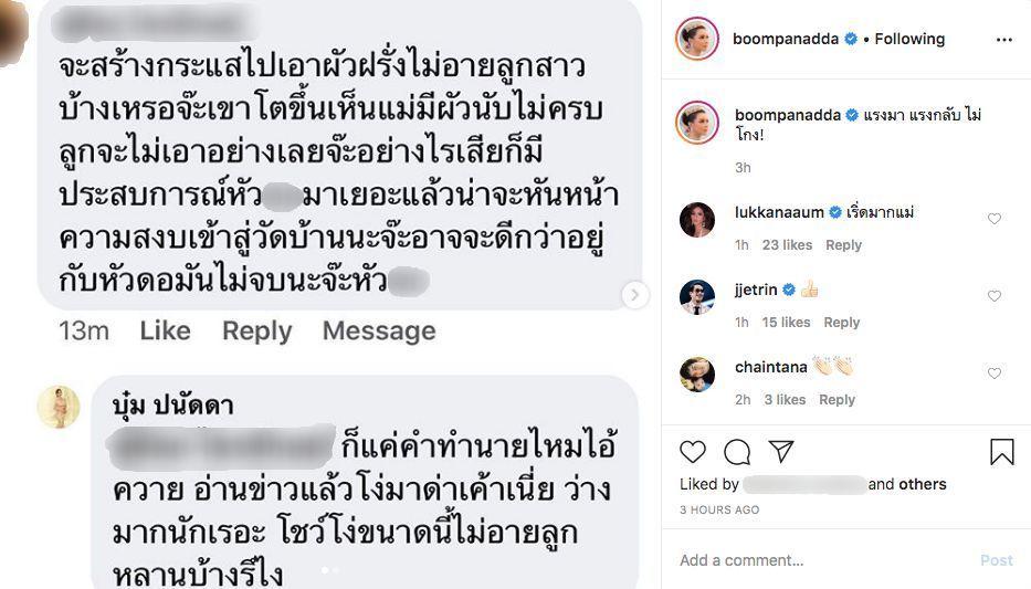 ล่าสุดมีชาวเน็ตรายหนึ่งเข้ามาคอมเมนต์เจ้าตัวถึงเรื่องนี้ด้วยข้อความรุนแรงว่า “จะสร้างกระแสไปเอาผัวฝรั่งไม่อายลูกสาวบ้างเหรอจ๊ะ เขาโตขึ้นเห็นแม่มีผัวนับไม่ครบ ลูกจะไม่เอาอย่างเลยจ๊ะ อย่างไรเสียก็มีประสบการณ์หัว__มาเยอะแล้วน่าจะหันหน้าความสงบเข้าสู่วัดบ้างนะจ๊ะ อาจจะดีกว่าอยู่กับหัว__ มันไม่จบนะจ๊ะหัว__” ทำเอาคุณแม่สุดแซ่บ บุ๋ม ปนัดดา สุดจะทน สวนกลับชาวเน็ตคนดังกล่าวไปว่า “ก็แค่คำทำนายไหมไอ้ควาย อ่านข่าวแล้วโง่มาด่าเค้าเนี่ย ว่างมากนักเรอะ โชว์โง่ขนาดนี้ไม่อายลูกหลานบ้างรึไง”