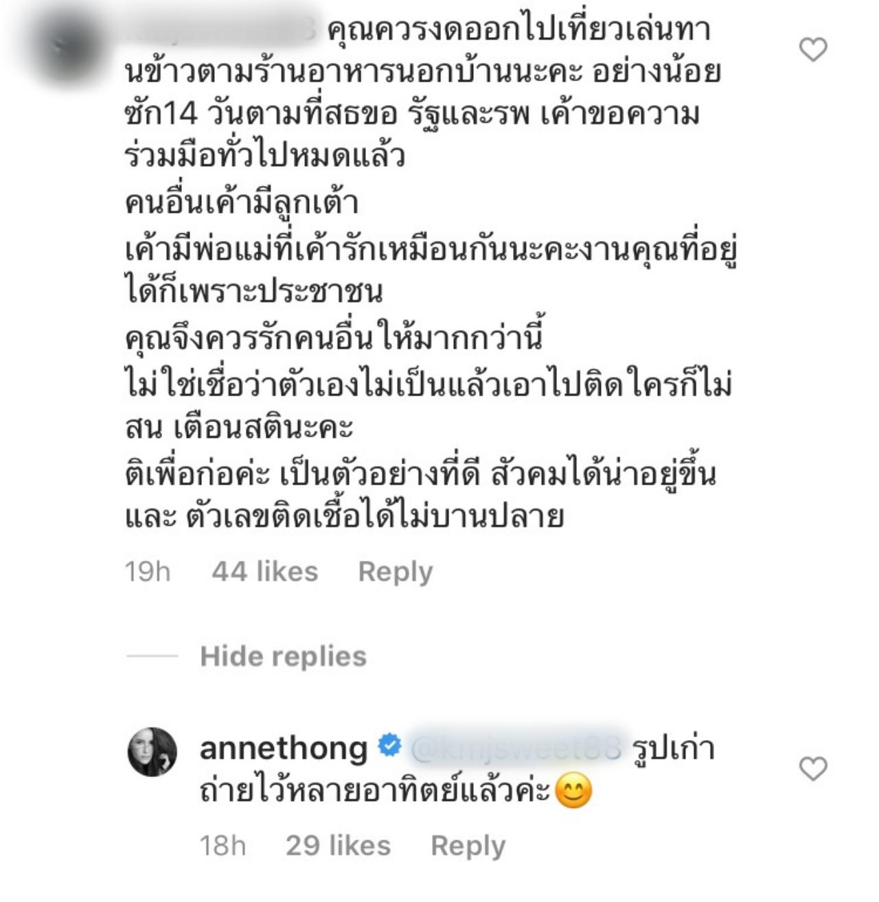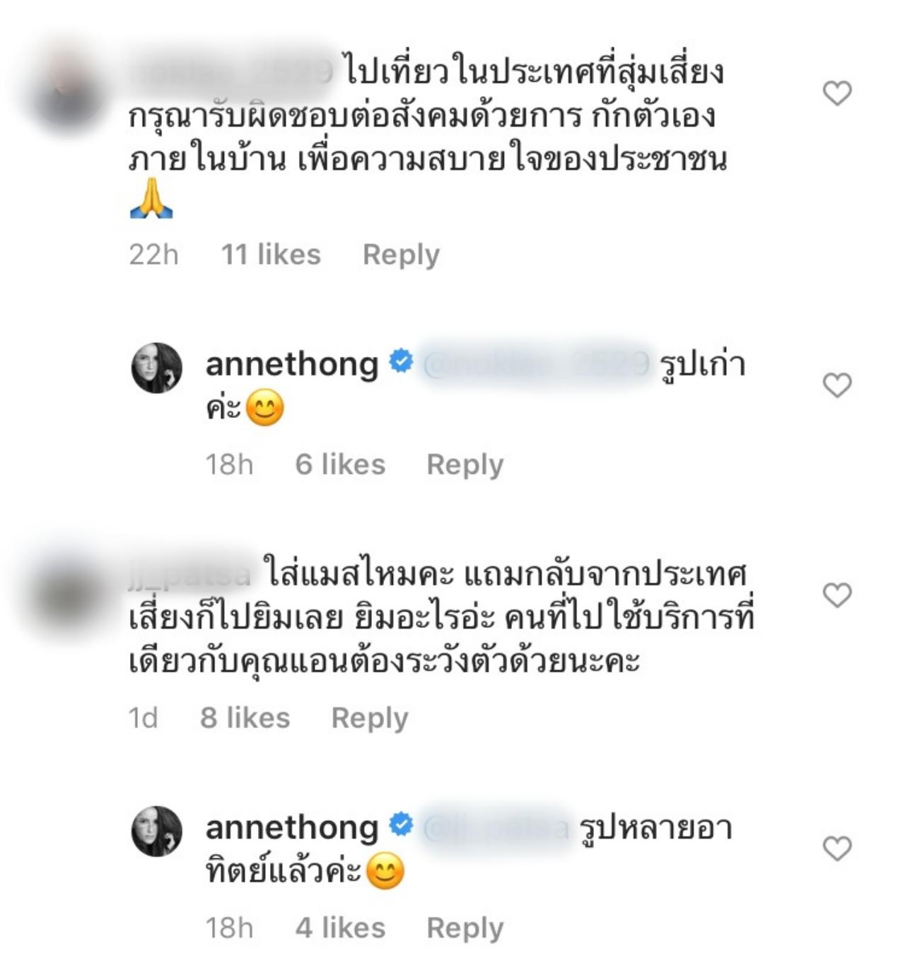 ล่าสุด นางเอกตัวแม่ แอน ทองประสม ก็เป็นอีกคนที่เพิ่งกลับมาจากไปเที่ยวที่ประเทศกลุ่มเสี่ยง และเจ้าตัวก็ได้โพสต์รูปนั่งกินกาแฟที่ร้านหลังจากที่กลับมาจากไปเที่ยว จนถูกชาวเน็ตเข้ามาติงว่าทำไมไม่กักตัวเองอยู่บ้านเพื่อเฝ้าดูอาการและเป็นการรับผิดชอบต่อสังคม จนทำให้สาวแอนต้องรีบออกมาชี้แจงกับชาวเน็ตว่า