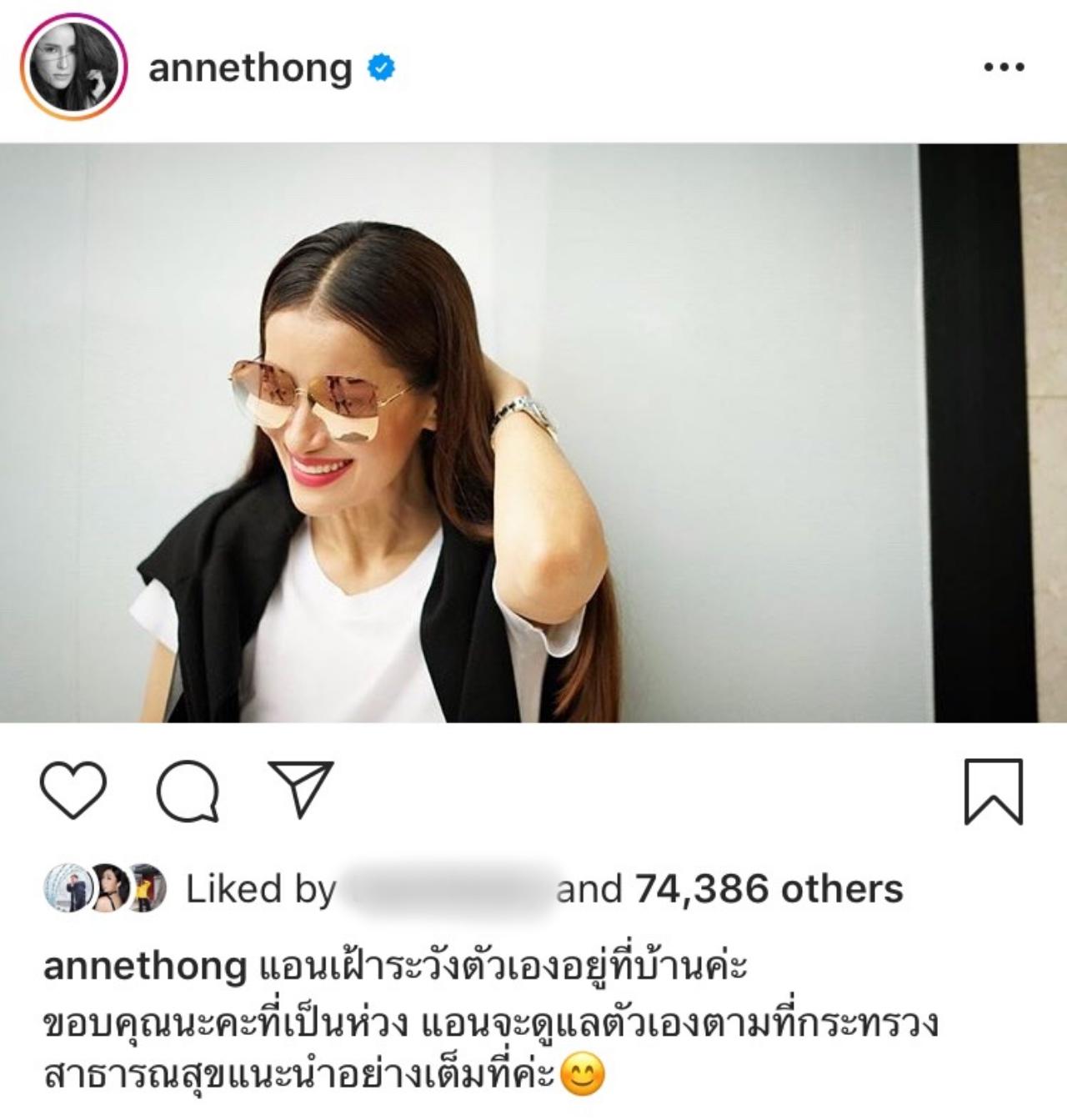 รูปที่เธอลงนั้นเป็นรูปที่ได้ถ่ายเอาไว้นานแล้ว และตัวเองเฝ้าระวังตัวอยู่ที่บ้าน ขอบคุณที่เป็นห่วง แอนจะดูแลตัวเองตามที่กระทรวงสาธารณสุขแนะนำอย่างเต็มที่ ซึ่งหลังจากที่สาวแอนได้ชี้แจงเรื่องชาวเน็ตสงสัยว่าทำไมไม่กักตัวเองไป ก็มีคนเข้ามาคอมเมนต์ขอบคุณที่ดูแลตัวเองเพื่อส่วนรวมและให้นักแสดงสาวพักผ่อนเยอะๆ เพราะเป็นห่วงอีกด้วย