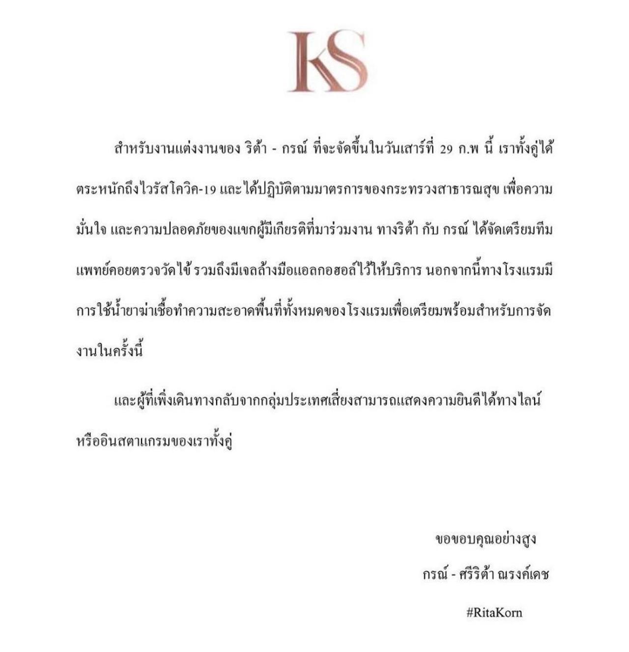 “เรียนเเขกของริต้า กับพี่กรณ์ ที่ได้รับเชิญมาร่วมงานวันที่ 29 ทุกท่านนะคะสำหรับวันสําคัญวันแต่งงานของ ริต้า พี่กรณ์ ที่จัดขึ้นในวันเสาร์ที่ 29 ก.พ.นี้ เราทั้งคู่ได้ตระหนักถึงไวรัสโควิด-19 และได้ปฏิบัติตามมาตรการของกระทรวงสาธารณสุข เพื่อความปลอดภัยของแขกผู้มีเกียรติที่มาร่วมงานเเละทางเราไม่สามารถเลื่อนการจัดงานออกไปได้ค่ะ