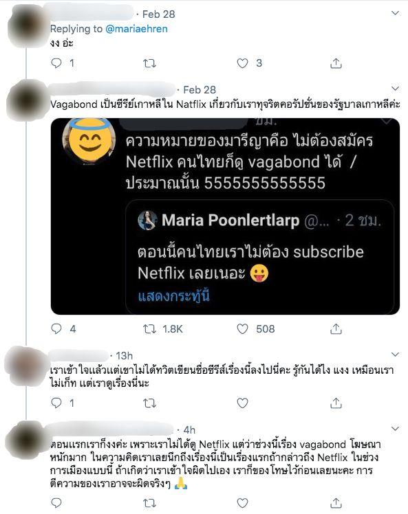 และหนึ่งในนั้นคือนางงามสาว มารีญา พูลเลิศลาภ มิสยูนิเวิร์สไทยแลนด์ 2017 ที่ได้แสดงความคิดเห็นถึงเรื่องนี้ด้วยเช่นกัน โดยเจ้าตัวได้ทวีตข้อความสุดจี๊ดว่า “ตอนนี้คนไทยเราไม่ต้อง subscribe Netflix เลยเนอะ” และใส่แฮชแท็ก “#IO” ซึ่งก็มีชาวทวิตเตอร์หลายคนเข้ามาแสดงความคิดเห็นว่า สิ่งที่ มารีญา กำลังสื่อนั้นหมายถึงว่า ไม่ต้องสมัคร Netflix คนไทยก็ดู Vagabond ได้ ซึ่ง Vagabond เป็นซีรีส์เกาหลีที่มีเนื้อหาเกี่ยวกับการทุจริตคอร์รัปชันของรัฐบาลเกาหลี ส่วน #IO หลายคนคาดเดาว่าน่าจะหมายถึงเรื่อง IO ทหาร ที่เป็นประเด็นร้อนแรงในเวลานี้