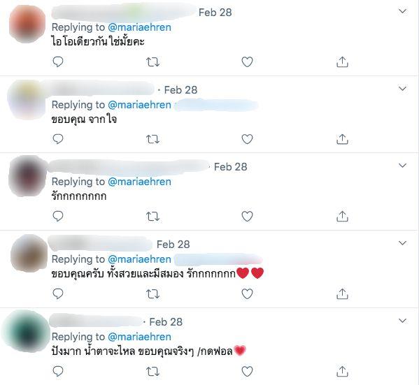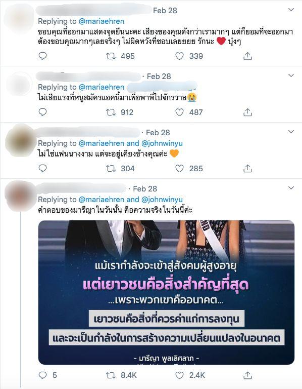 โดยต่างบอกว่าไม่เสียแรงที่ชื่นชมว่า มารีญา เป็นนางงามที่สมมงมาก บ้างก็บอกว่าดีใจที่เชียร์ถูกคน ขอบคุณที่แสดงจุดยืน บ้างก็หยิบยกคำพูดที่มารีญาเคยตอบคำถามรอบ 5 คนสุดท้าย ในการประกวด Miss Universe 2017 เมื่อวันที่ 27 พ.ย. 2560 ว่า “แม้เรากำลังจะเข้าสู่สังคมผู้สูงอายุ แต่เยาวชนคือสิ่งสำคัญที่สุด เพราะพวกเขาคืออนาคต เยาวชนคือสิ่งที่ควรค่าแก่การลงทุน และจะเป็นกำลังในการสร้างความเปลี่ยนแปลงในอนาคต” พร้อมทั้งบอกว่า “คำตอบของมารีญาในวันนั้น คือความจริงในวันนี้ค่ะ” ด้วย.
