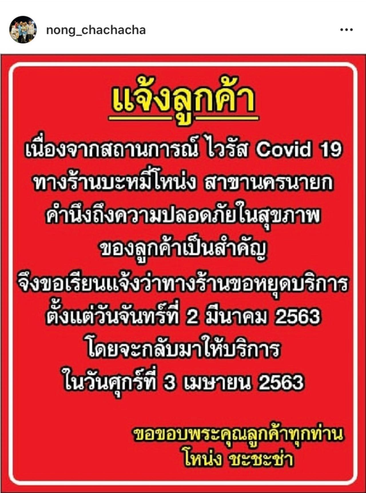 และงานนี้ตลกชื่อดัง โหน่ง ชะชะช่า ที่มีกิจการเปิดร้ายก๋วยเตี๋ยว ก็ได้ตระหนักถึงความอันตรายของไวรัสโควิด-19 เลยให้ความร่วมมือ ด้วยการประกาศสั่งปิดร้านก๋วยเตี๋ยวของตัวเองผ่านทางอินสตาแกรมของตัวเองว่า