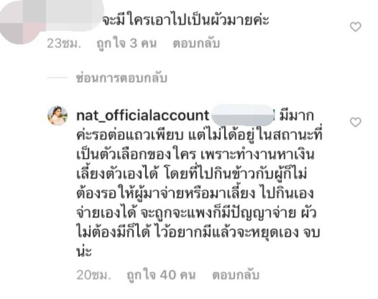 ซึ่งก็มีหนึ่งคอมเมนต์ที่เข้ามาถามว่า "จะมีใครเอาไปเป็นผัวมายค่ะ" ซึ่ง สาวแน๊ตก็ตอบกลับเผ็ดร้อนว่า มีมากค่ะ รอต่อแถวเพียบ แต่ไม่ได้อยู่ในสถานะที่เป็นตัวเลือกของใคร เพราะทำงานหาเงินเลี้ยงตัวเองของใคร เพราะทำงานหาเงินเลี้ยงตัวเองได้ โดยที่ไปกินข้าวกับผู้ก็ไม่ต้องรอให้ผู้มาจ่ายหรือมาเลี้ยง ไปกินเองจ่ายเองได้ จะถูกจะแพงก็มีปัญญาจ่าย ผัวก็ไม่ต้องมีก็ได้ ไว้อยากมีแล้วจะหยุดเอง จบนะ".