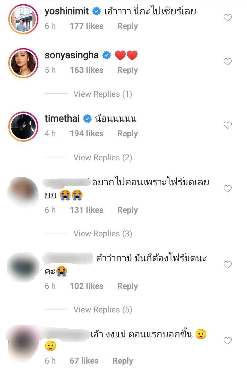 ด้านเพื่อนๆ ในวงการบันเทิง อาทิ กอล์ฟ พิชญะ ถึงกับถามว่า “ไหนเล่าๆๆๆๆดิ๊!!!! มันยังไงหรอ” ส่วนคุณแม่สุดแซ่บ ใบเตย อาร์สยาม ก็บอกว่า “นี่ก็อดขึ้นอะ เค้าไม่เอาลูกทุ่งขึ้น”, เนย-แจม เนโกะจัมพ์ ซึ่งไม่ได้ขึ้นคอนเสิร์ตกามิกาเซ่เช่นกัน ก็เข้ามาคอมเมนต์เป็นอีโมจิรูปหัวใจ ด้าน ธามไท หนุ่มคนสนิทของโฟร์ ซึ่งได้ขึ้นคอนเสิร์ตครั้งนี้ เข้ามาคอมเมนต์แซวรูปของ โฟร์-มด ว่า “น้อนนนนน” และมีแฟนๆ บอกว่าให้พา โฟร์ ขึ้นคอนเสิร์ตด้วย.