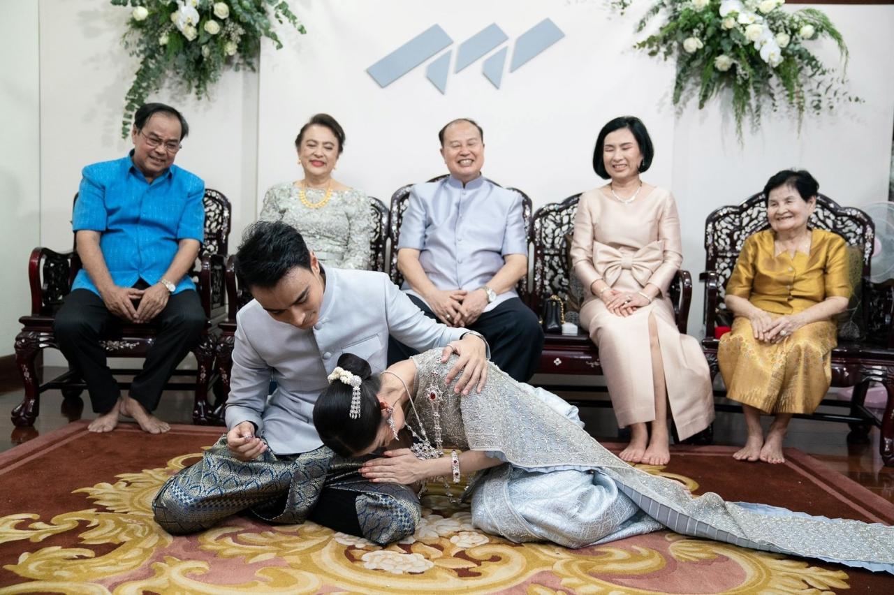 จากนั้นช่วงบ่ายเจ้าบ่าวก็เชิญ คุณพ่อเกรียงสิทธิ์ และคุณแม่ผดุงศรี พร้อมทั้งเกณฑ์ คุณน้า แอ๊ว-อำภา ภูษิต, พี่ชาย เต้-สุผจญ, พี่สะใภ้ ปาล์ม-ชลณัฏฐ์ กลิ่นสุวรรณ รวมทั้งญาติสนิท และเพื่อนๆ ไปตั้งขบวนขันหมาก แห่มาสู่ขอเจ้าสาวจาก คุณแม่สุวีณา ศรีนารีย์ อย่างเป็นทางการ สินสอดประกอบด้วย แหวนเพชร 1 กะรัต, ต่างหูเพชร 1 กะรัต, ทองคำหนัก 29 บาท, เงินสด 1 ล้านบาท, แคชเชียร์เช็ค 3 ล้านบาท และโฉนดที่ดิน 1 ไร่ ต่อด้วยพิธีรับไหว้ญาติผู้ใหญ่ทั้งสองฝ่าย หมั้น และรดน้ำสังข์