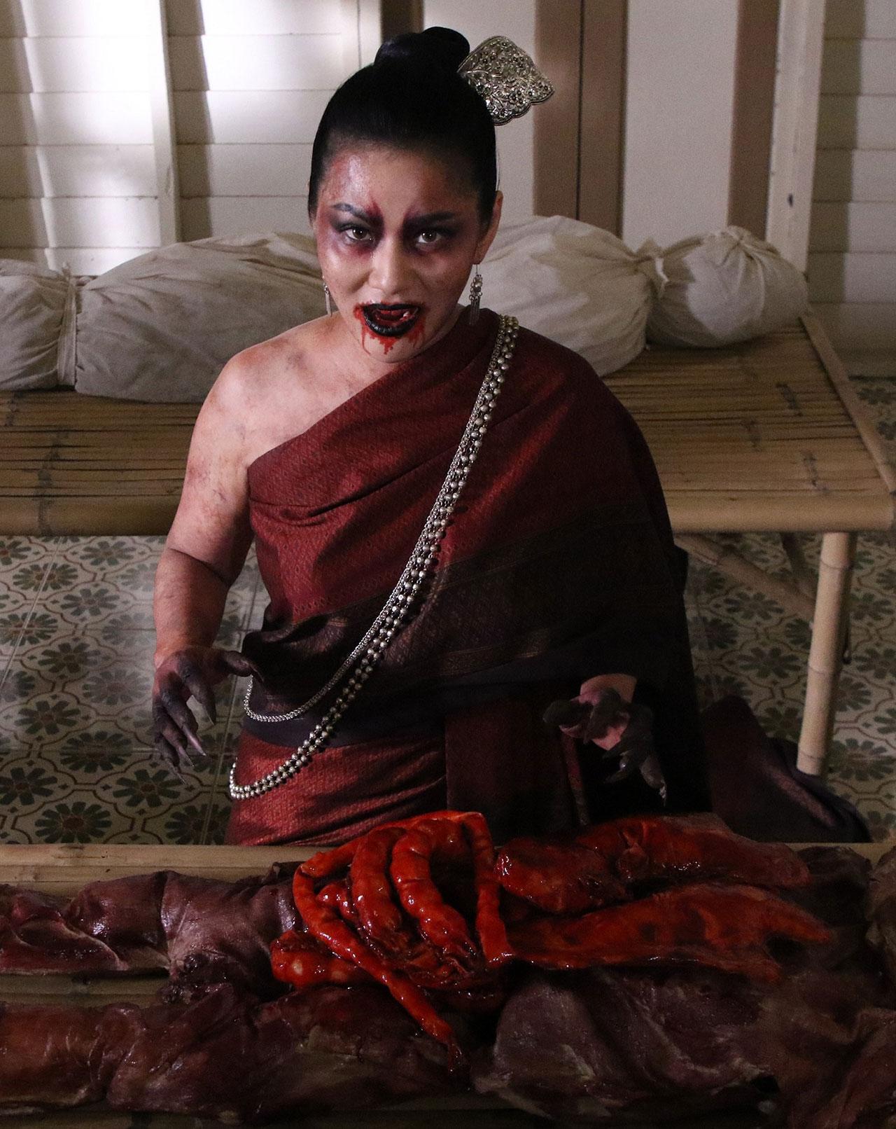 ส่วนแป้งขอซ้อมแอ็กติ้งผีเข้า ตาค้าง หน้าดุ ให้เหมือนจริง เมื่อพร้อมก็เริ่มถ่ายกันเลย แป้งพยายามหลอกล่อเหยื่อที่เพิ่งหายไข้ เข้าไปในห้องดับจิตของสถานพยาบาล ทำทีว่าให้เข้าไปเป็นเพื่อน เพราะกลัวผี แบบหน้าตาใสๆ ไม่มีพิษสง พอได้จังหวะ เมื่อแป้งกลายร่าง เป็นน้ำผึ้งที่แต่งปอบ เหยื่อตกใจ ทรุดลง น้ำผึ้งทำตาโตขู่ ใช้เล็บยาวคมทะลวงช่องอก ช่องท้อง ของเหงื่ออย่างไรความปรานี น้ำผึ้งกลายเป็นเลเวลปอบเต็มตัว ดวงตาแดง เล็บยาวคม ปากสีแดงคล้ำ แถมแลบลิ้น แยกเขี้ยวแบบหื่นกระหาย หิวเต็มที่ ทันทีที่เหยื่อกลัวจนลนลาน น้ำผึ้งยื่นเล็บคมทะลวงควักไส้ หัวใจ ตับ ออกมากิน อย่างเอร็ดอร่อยแบบไม่แคร์กลิ่น เหมือนบุพเฟต์อาหารเช้า