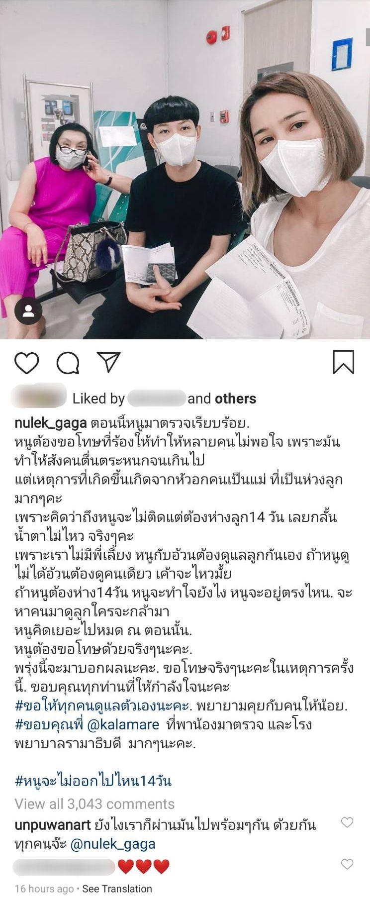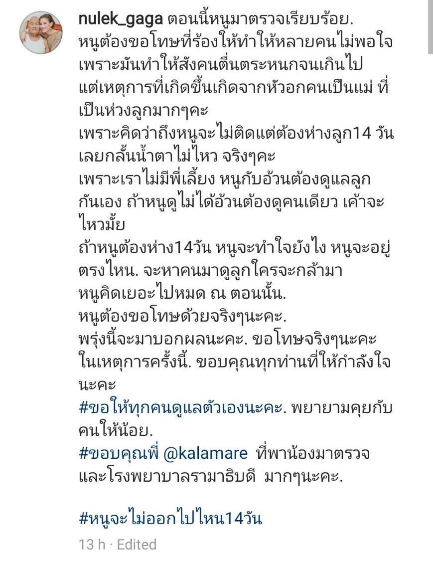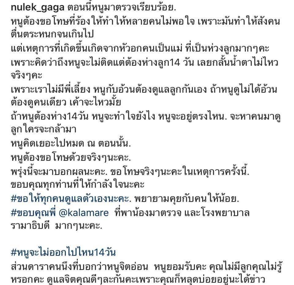 โดย หนูเล็ก ก่อนบ่าย ได้โพสต์รูปภาพตัวเอง พร้อมกับ ม้า อรนภา และ ดีเจนุ้ย ธนวัฒน์ เดินทางไปตรวจเชื้อไวรัสโควิด-19 ผ่านทางอินสตาแกรมของตัวเอง และเขียนแคปชั่นที่ทำให้หลายคนสงสัย “ตอนนี้หนูมาตรวจเรียบร้อย หนูต้องขอโทษที่ร้องไห้ทำให้หลายคนไม่พอใจ เพราะมันทำให้สังคมตื่นตระหนกจนเกินไป แต่เหตุการณ์ที่เกิดขึ้นเกิดจากหัวอกคนเป็นแม่ ที่เป็นห่วงลูกมากๆ คะ เพราะคิดว่าถึงหนูจะไม่ติดแต่ต้องห่างจากลูก 14 วัน เลยกลั้นน้ำตาไม่ไหว” แถมปิดท้ายด้วยประโยคนี้ “ส่วนดาราคนนึงที่บอกว่าหนูจิตอ่อน หนูยอมรับคะ คุณไม่มีลูกคุณไม่รู้หรอกคะ ดูแลจิตคุณดีๆละกันคะ เพราะคุณก็หลุดบ่อยอยู่นะได้ข่าว”
