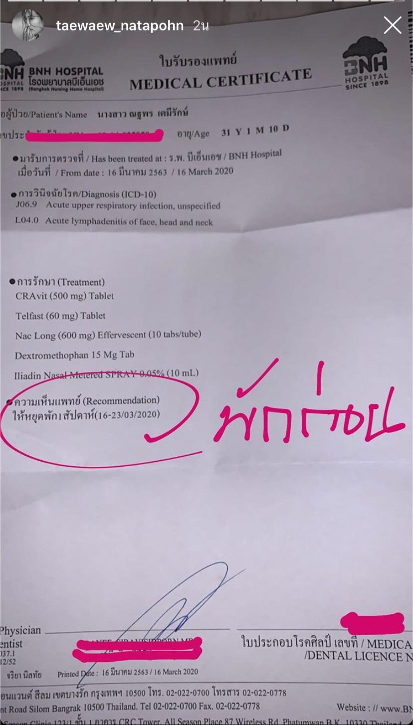 โดยวานนี้ (15 มี.ค.63) วัดไข้ได้ 37.3 องศาเซลเซียส พร้อมแคปชั่น “ยังไงล่ะแมมม่” และวันนี้ (16 มี.ค.63) วัดได้ 37.4 องศาเซลเซียส พร้อมแคปชั่นว่า “ลงได้แล้วม้างงง” เพราะยังมีไข้ สาวแต้วเลยไปหาหมอที่โรงพยาบาลเพื่อตรวจร่างกายอีกครั้ง และหมอได้ให้สาวแต้วหยุดพัก 1 สัปดาห์เพื่อเป็นการรักษาสุขภาพให้หายป่วย บันเทิงไทยรัฐออนไลน์ก็ขอให้สาวแต้วหายป่วยเร็วๆ นะคะ.