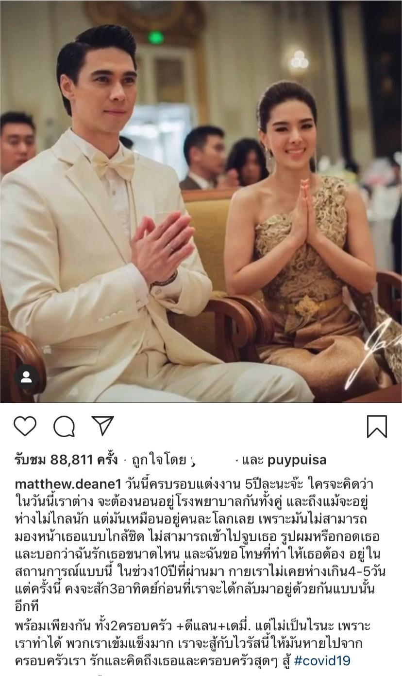 หลังจากที่สองสามีภรรยา ลีเดีย ศรัณย์รัชต์ และ แมทธิว ดีน ประกาศว่าตัวเองติดเชื้อไวรัสโควิด-19 และต้องแยกกับครอบครัวและลูกน้อยทั้ง 2 คนเพื่อไปพักรักษาตัวมให้หายจากโรคดังกล่าว และในวันนี้ 16 มีนาคม ก็เป็นวันครบรอบแต่งงานของลีเดียและแมทธิว ซึ่งงานนี้แมทธิวก็ได้โพสต์ข้อความในวันครบรอบแต่งงานถึงภรรยาสุดที่รักผ่านทางอินสตาแกรมของตัวเองว่า