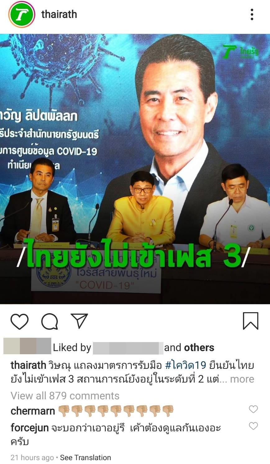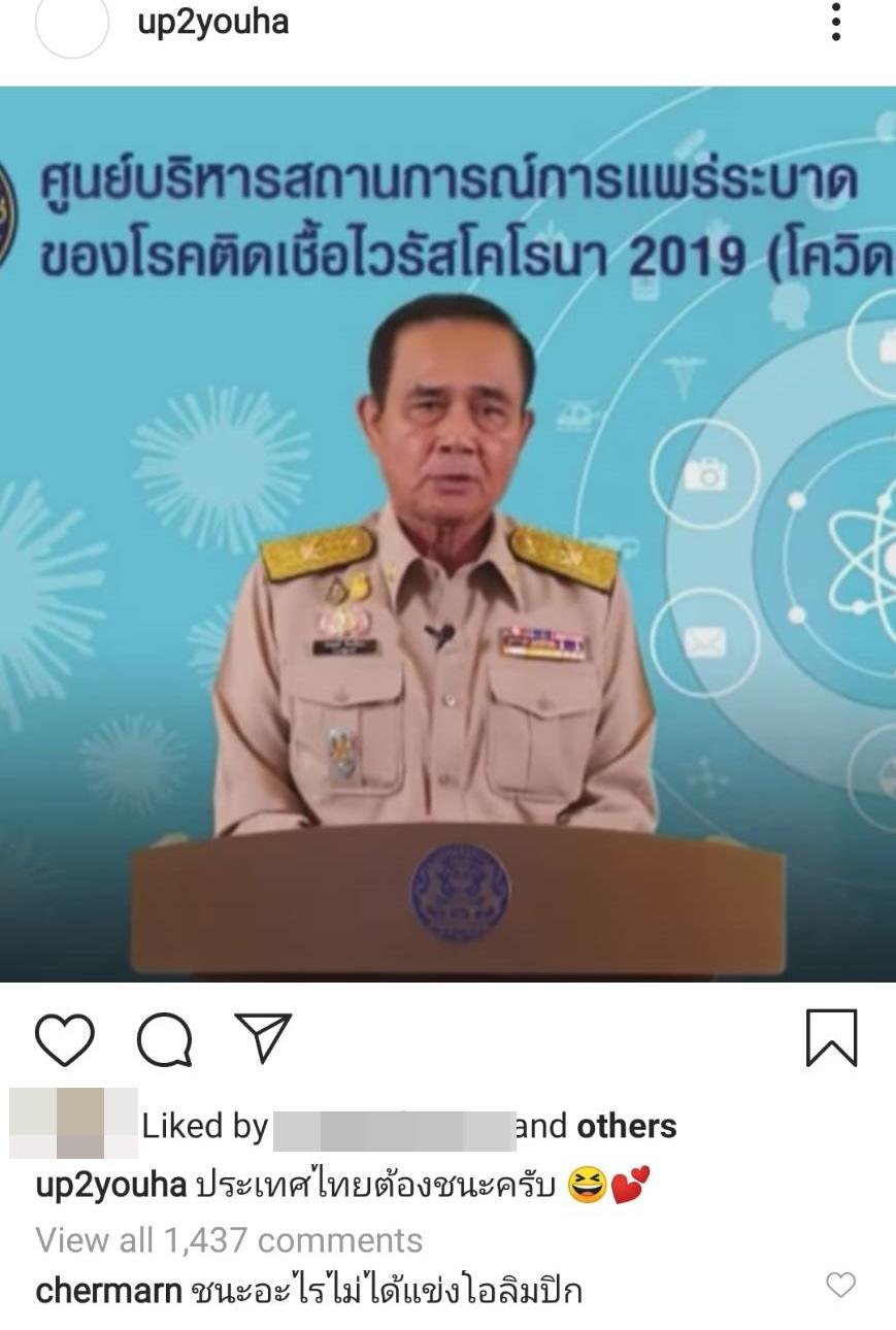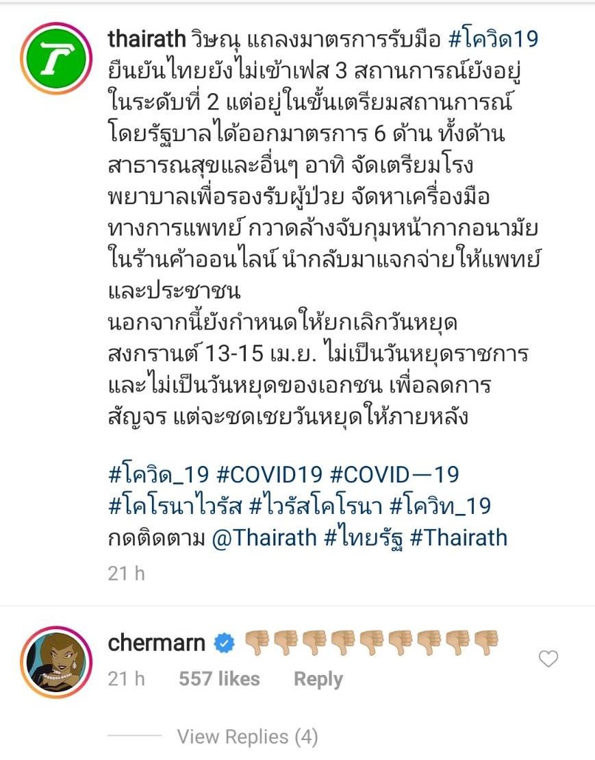 นอกจากนี้ในไอจี @thairath ที่มีการรายงานข่าว นายวิษณุ เครืองาม รองนายกรัฐมนตรี แถลงมาตรการรับมือ โควิด19 ยืนยันไทยยังไม่เข้าเฟส 3 สถานการณ์ยังอยู่ในระดับที่ 2 แต่อยู่ในขั้นเตรียมสถานการณ์ โดยรัฐบาลได้ออกมาตรการ 6 ด้าน ทั้งด้านสาธารณสุขและอื่นๆ อีกทั้งยังมีการเสนอให้ยกเลิกวันหยุดสงกรานต์ 13-15 เม.ย. ไม่เป็นวันหยุดราชการ และไม่เป็นวันหยุดของเอกชน เพื่อลดการสัญจร แต่จะชดเชยวันหยุดให้ภายหลัง ซึ่ง พลอย เฌอมาลย์ ก็ได้เข้าไปแสดงความคิดเห็นเป็นอีโมจิรูปคว่ำนิ้วโป้งลง (thumb down) ด้วย.