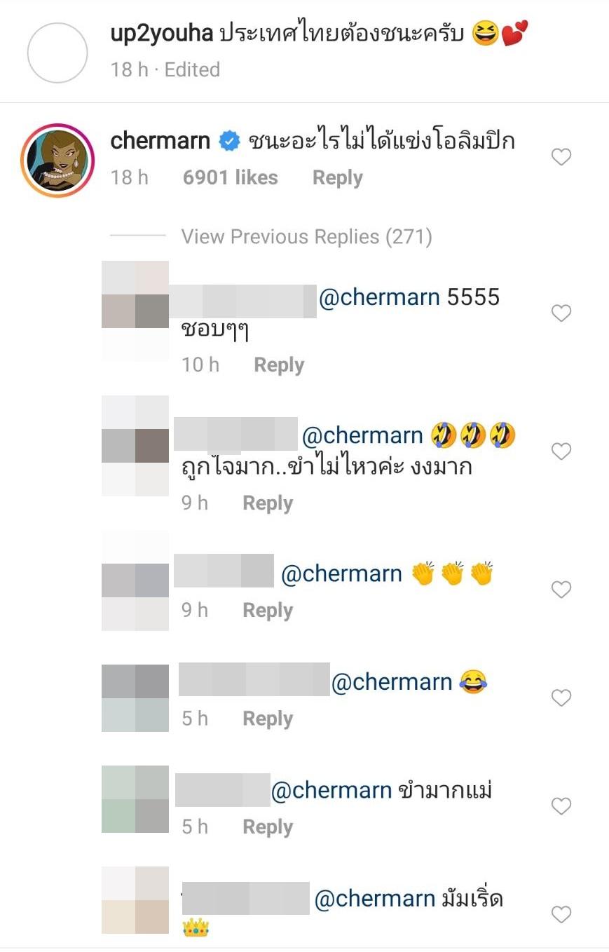 ซึ่งนอกจากจะมีชาวเน็ตเข้าไปคอมเมนต์วิพากษ์วิจารณ์อย่างหนักแล้ว นางเอกสาวแซ่บ พลอย เฌอมาลย์ บุญยศักดิ์ ก็เข้าไปแสดงความคิดเห็นด้วยเช่นกัน กับประโยคเด็ดสั้นๆ แต่แซ่บมาก “ชนะอะไร ไม่ได้แข่งโอลิมปิก” และมีแฟนๆ แห่กดไลค์ พร้อมทั้งแสดงความคิดเห็นเพิ่มเติมเป็นจำนวนมาก โดยส่วนมากบอกว่าคุณมัมแซ่บมาก ฟาดมากแม่ ให้คะแนน 10 10 10