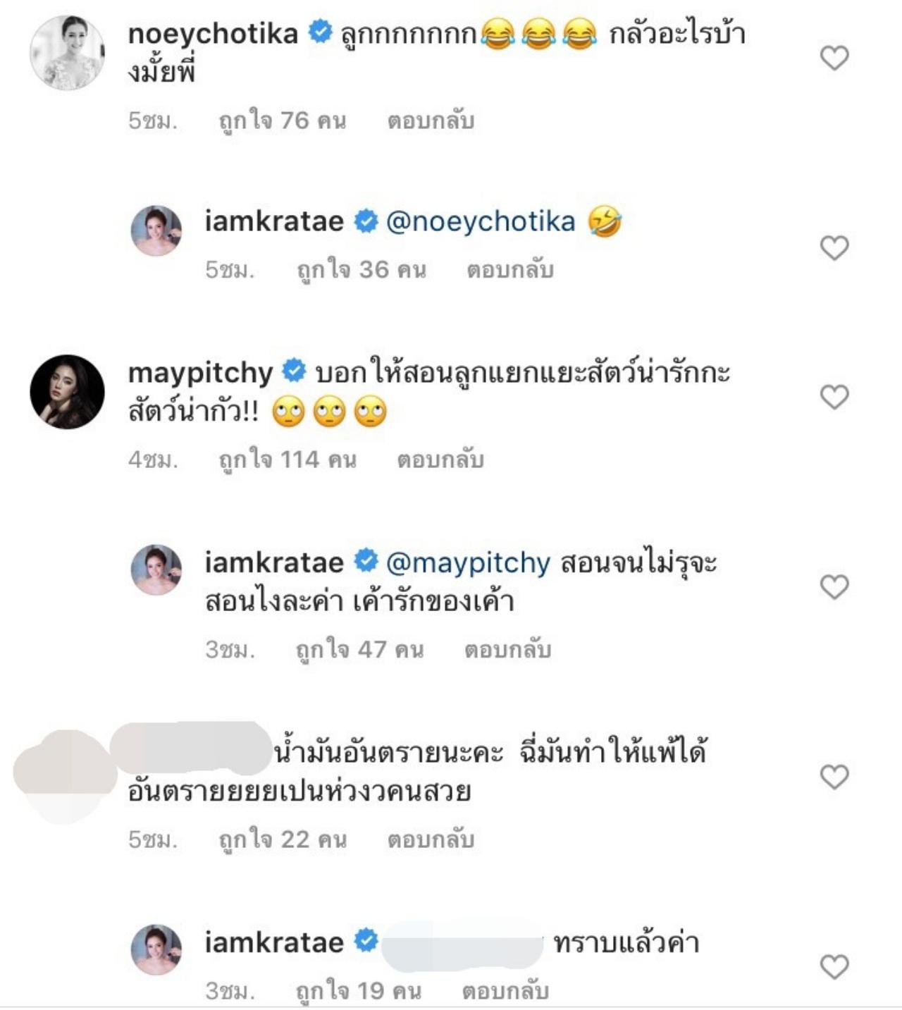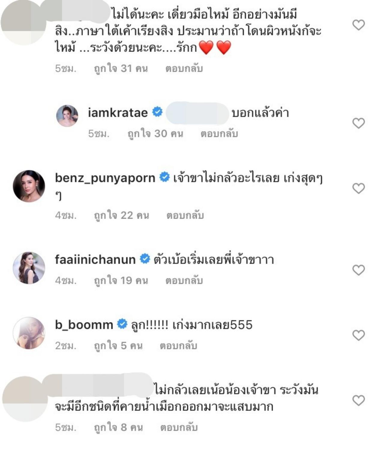 งานนี้ทำเอาเหล่าป้าๆ น้าๆ มาคอมเมนต์รูปพี่เจ้าขากันเพียบ อย่าง เนย โชติกา คอมเมนต์ว่า "ลูกกกก กลัวอะไรบ้างมั้ยพี่" ขณะที่ เมย์ พิชญ์นาฏ คอมเมนต์ว่า "บอกให้สอนลูกแยกแยะสัตว์น่ารักกะสัตว์น่ากลัว" โดย กระแต คอมเมนต์กลับว่า "สอนจนไม่รู้จะสอนยังไงละค่า เค้ารักของเค้า"