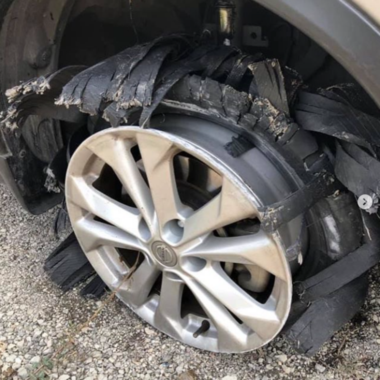 ภาพที่เห็นคือยางแตกแหลกมาก เสียงแกร๊งๆ คือรถวิ่งมาด้วยล้อแม็กซ์ล้วนๆ เคยอ่านเจอว่า การอยู่ในเส้นทางที่รถทุกคันใช้ความเร็ว ควรอยู่ในรถ และคาดเข็มขัดนิรภัยไว้แม้รถจอดนิ่งก็ตาม ค่อยโทรฯแจ้งตำรวจ และประกัน
