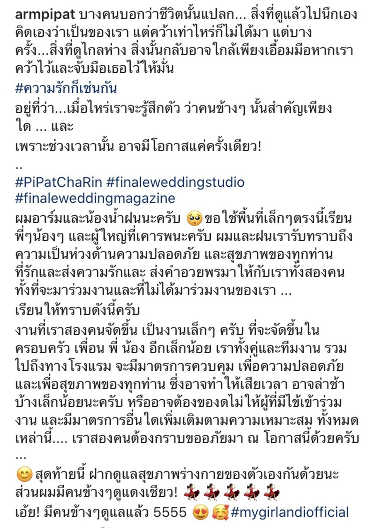 ผมอาร์มและน้องน้ำฝนนะครับ ขอใช้พื้นที่เล็กๆตรงนี้เรียนพี่ๆน้องๆ และผู้ใหญ่ที่เคารพนะครับ ผมและฝนเรารับทราบถึงความเป็นห่วงด้านความปลอดภัย และสุขภาพของทุกท่าน ที่รักและส่งความรักและ ส่งคำอวยพรมาให้กับเราทั้งสองคน ทั้งที่จะมาร่วมงานและที่ไม่ได้มาร่วมงานของเรา ...