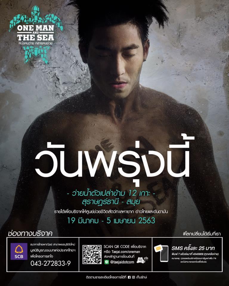 หนึ่งคนว่ายหลายคนช่วย” โดยจะว่ายน้ำตัวเปล่าข้าม 12 เกาะในอ่าวไทย ในวันที่ 19 มี.ค. ไปจนถึงวันที่ 5 เม.ย. 2563 รวมระยะเวลา 18 วัน เพื่อรับบริจาคเงินซื้ออุปกรณ์ทางการแพทย์ให้แก่ศูนย์รักษาพันธุ์สัตว์ทะเลหายากทั้งอ่าวไทยและอันดามัน พร้อมทั้งกระตุ้นคนไทยใส่ใจลดขยะอนุรักษ์ทะเล