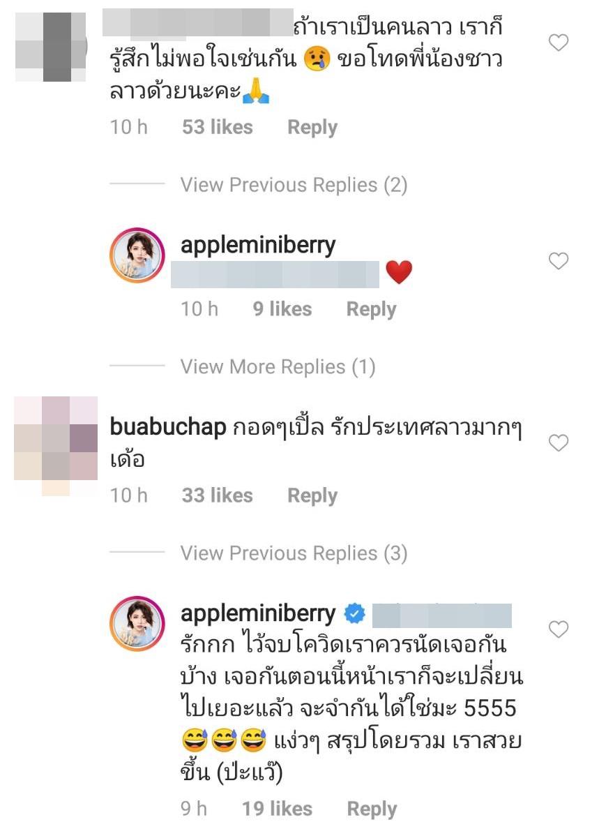 โดย แอปเปิ้ล โพสต์คลิปข่าวดังกล่าว และเขียนข้อความว่า “เปิ้ลชื่นชมพี่มาตลอดว่าเป็นผู้ประกาศข่าวที่อ่านข่าวแล้วสนุกมากและตรงไปตรงมา เปิ้ลดูประจำนะคะ แต่รอบนี้ เอาจริงๆ เปิ้ลว่า พี่จะสนุกเกินไป จนเหมือนบูลลี่ประเทศลาว ประเทศของเปิ้ลเลยล่ะค่ะ เปิ้ลคนลาวคนนึงที่ฟังแล้วบอกตรงๆ ว่า รู้สึกโมโห และรู้สึกว่า ทำไมพี่ถึงต้องเน้นถ้อยเน้นคำขนาดนี้