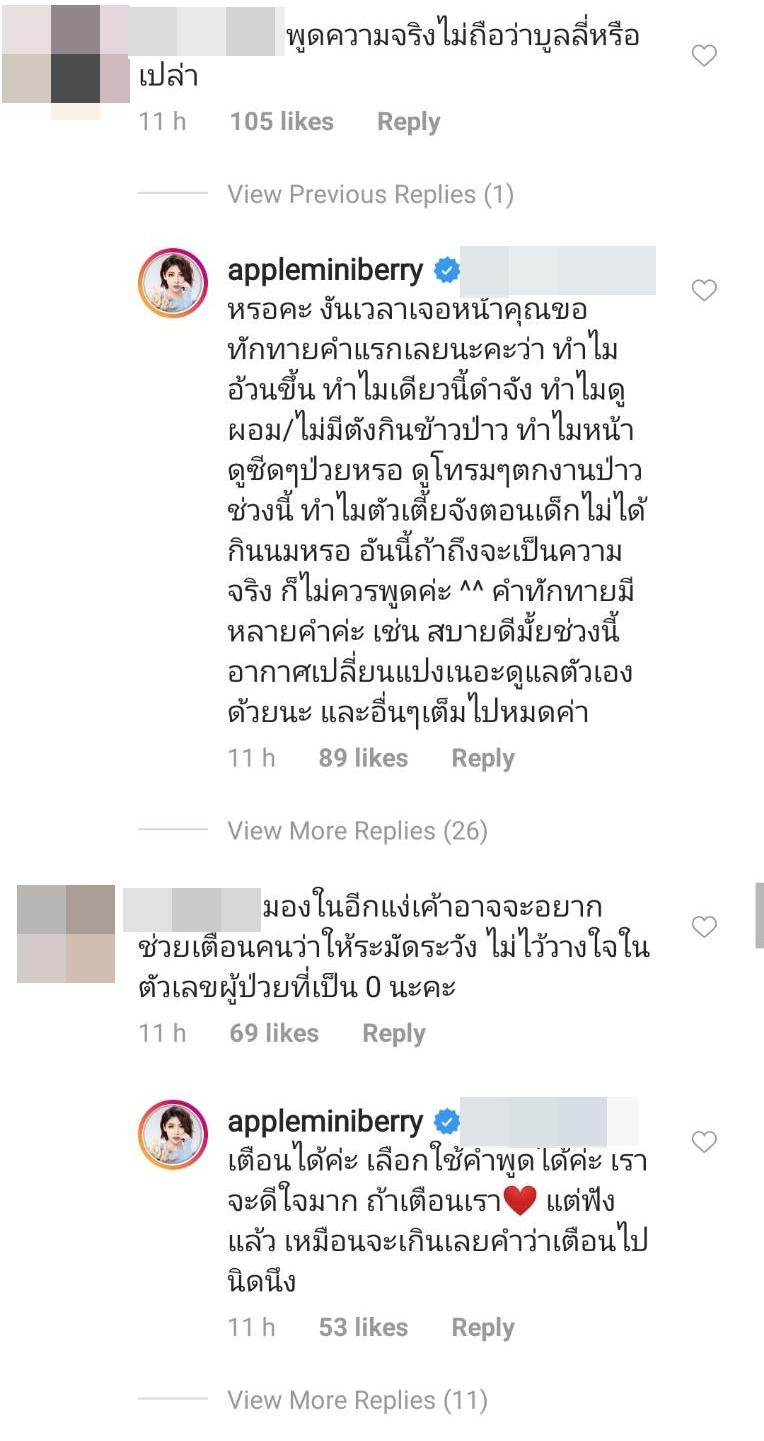 งานนี้เลยมีชาวเน็ตเข้ามาแสดงความคิดเห็นเป็นจำนวนมาก มีทั้งคนที่เข้ามาให้กำลังใจ โดยบอกว่าเข้าใจความรู้สึก แต่ก็มีบางส่วนที่วิจารณ์ แอปเปิ้ล ในทางเสียหาย บ้างก็บอกว่าถ้าพูดความจริงก็ไม่ถือว่าเป็นการบูลลี่รึเปล่า ฟังแล้วก็รู้สึกว่าเป็นการรายงานข่าวตามปกติ บางคนก็บอกว่า มองในอีกแง่เขาอาจจะอยากช่วยเตือนคนว่าให้ระมัดระวัง ไม่ไว้วางใจในตัวเลขผู้ป่วยที่เป็น 0