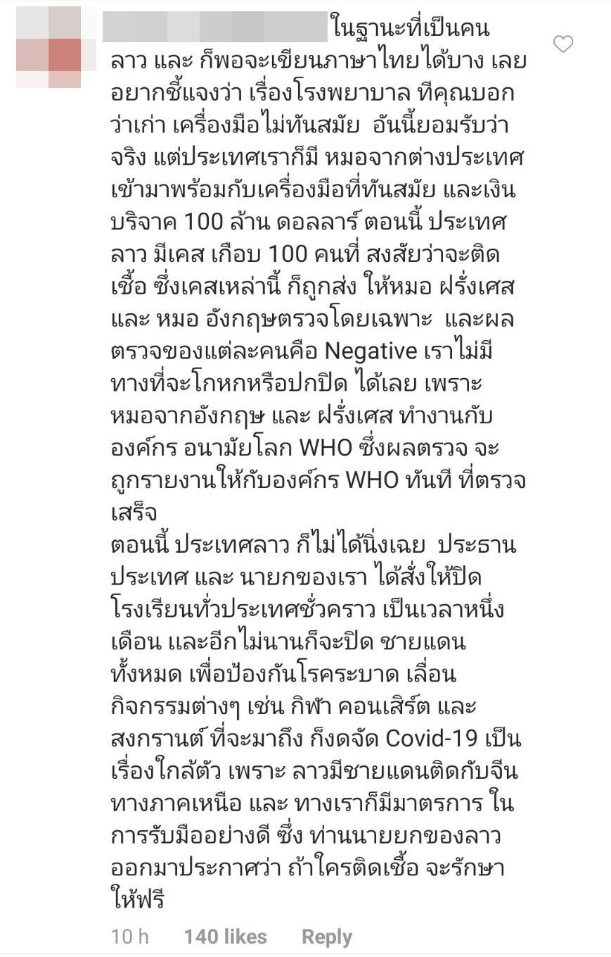 นอกจากนี้ ยังมีประชาชนชาวลาวที่เข้ามาแสดงความคิดเห็นว่า “เรื่องโรงพยาบาล ที่คุณบอกว่าเก่า เครื่องมือไม่ทันสมัย อันนี้ยอมรับว่าจริง แต่ประเทศเราก็มีหมอจากต่างประเทศ เข้ามาพร้อมกับเครื่องมือที่ทันสมัย และเงินบริจาค 100 ล้านดอลลาร์ ตอนนี้ประเทศลาวมีเคสเกือบ 100 คนที่สงสัยว่าจะติดเชื้อ ซึ่งเคสเหล่านี้ก็ถูกส่งให้หมอฝรั่งเศส และ หมออังกฤษตรวจโดยเฉพาะ และผลตรวจของแต่ละคนคือ Negative เราไม่มีทางที่จะโกหกหรือปกปิด ได้เลย เพราะ หมอจากอังกฤษ และ ฝรั่งเศส ทำงานกับ องค์กร อนามัยโลก WHO ซึ่งผลตรวจจะถูกรายงานให้กับองค์กร WHO ทันทีที่ตรวจเสร็จ