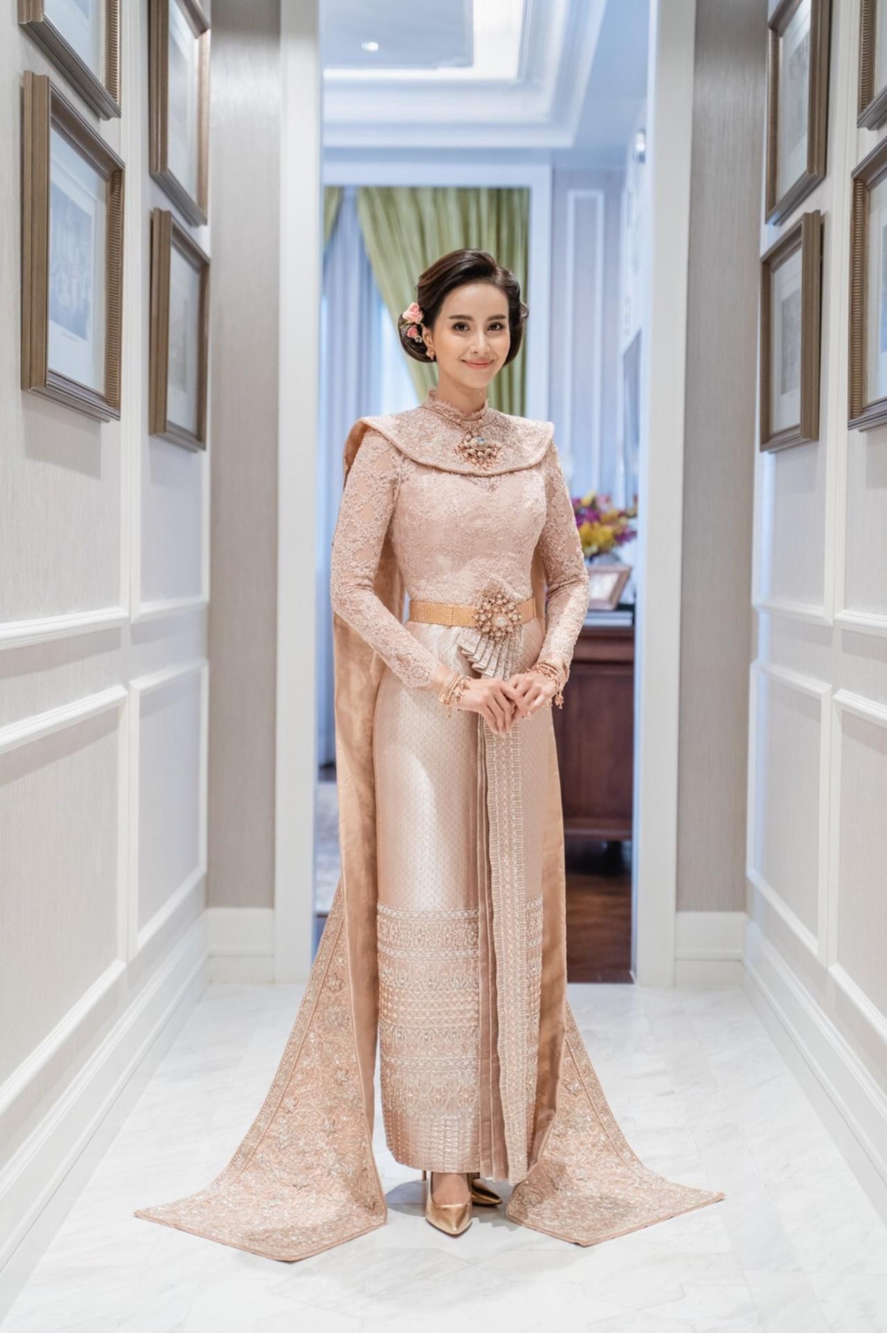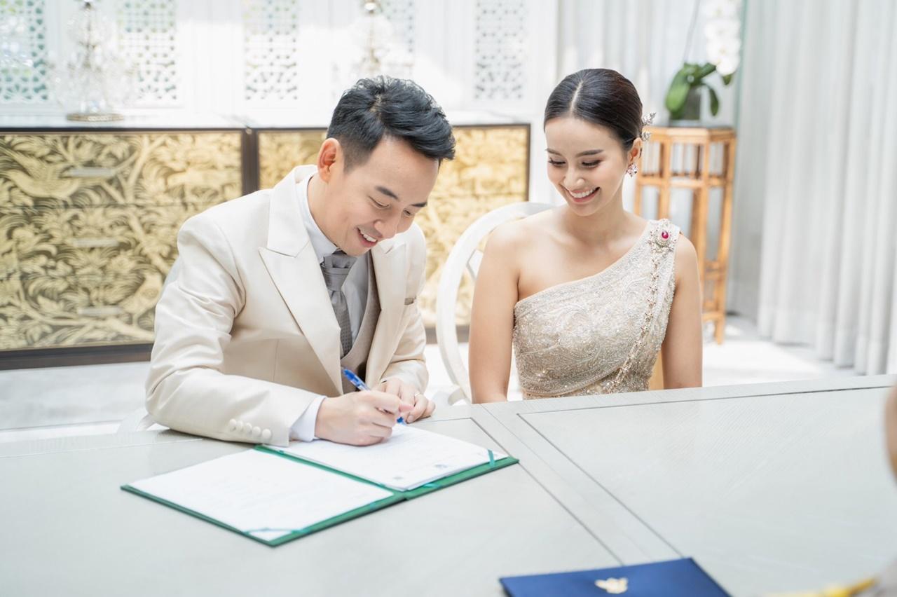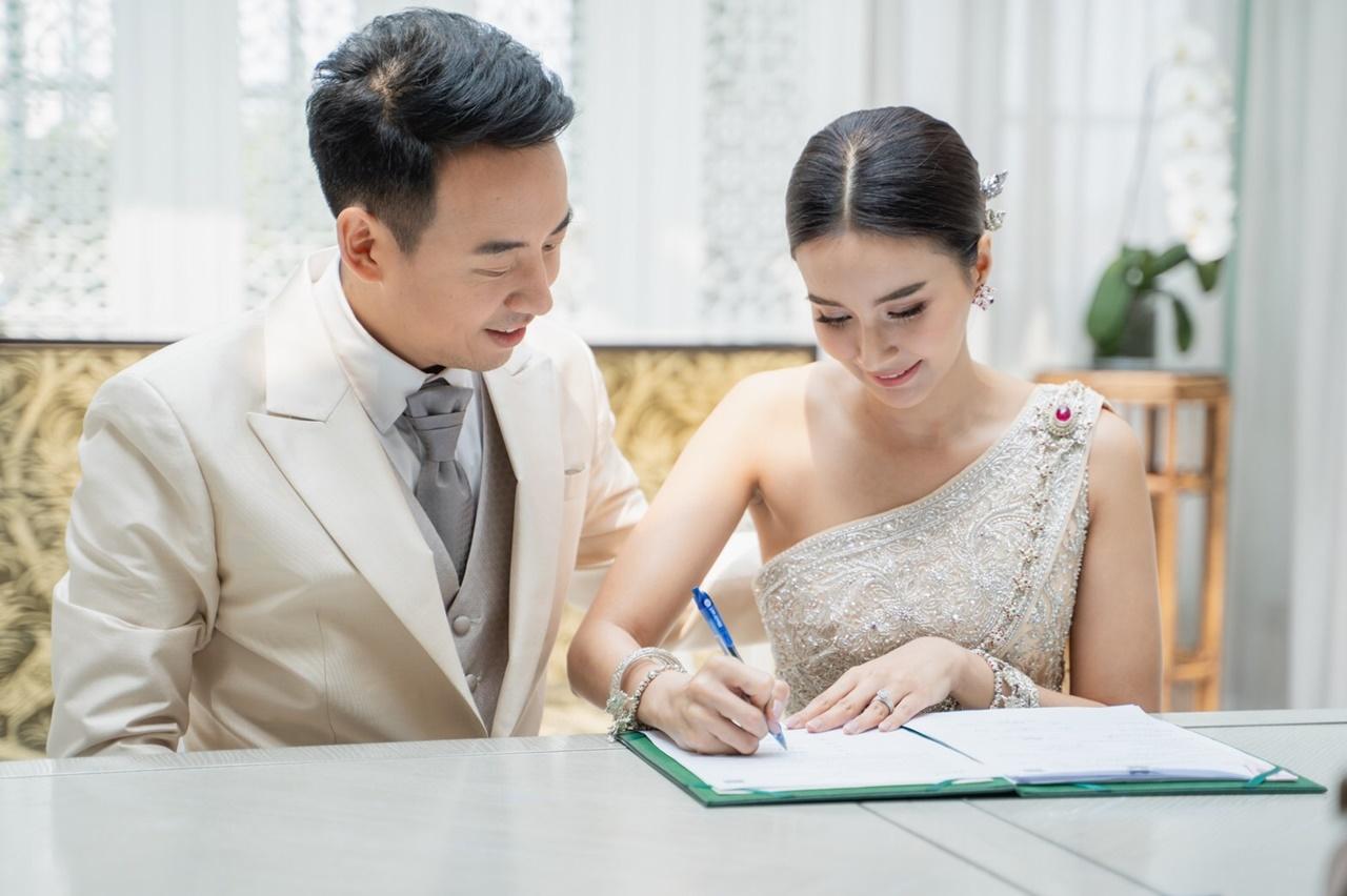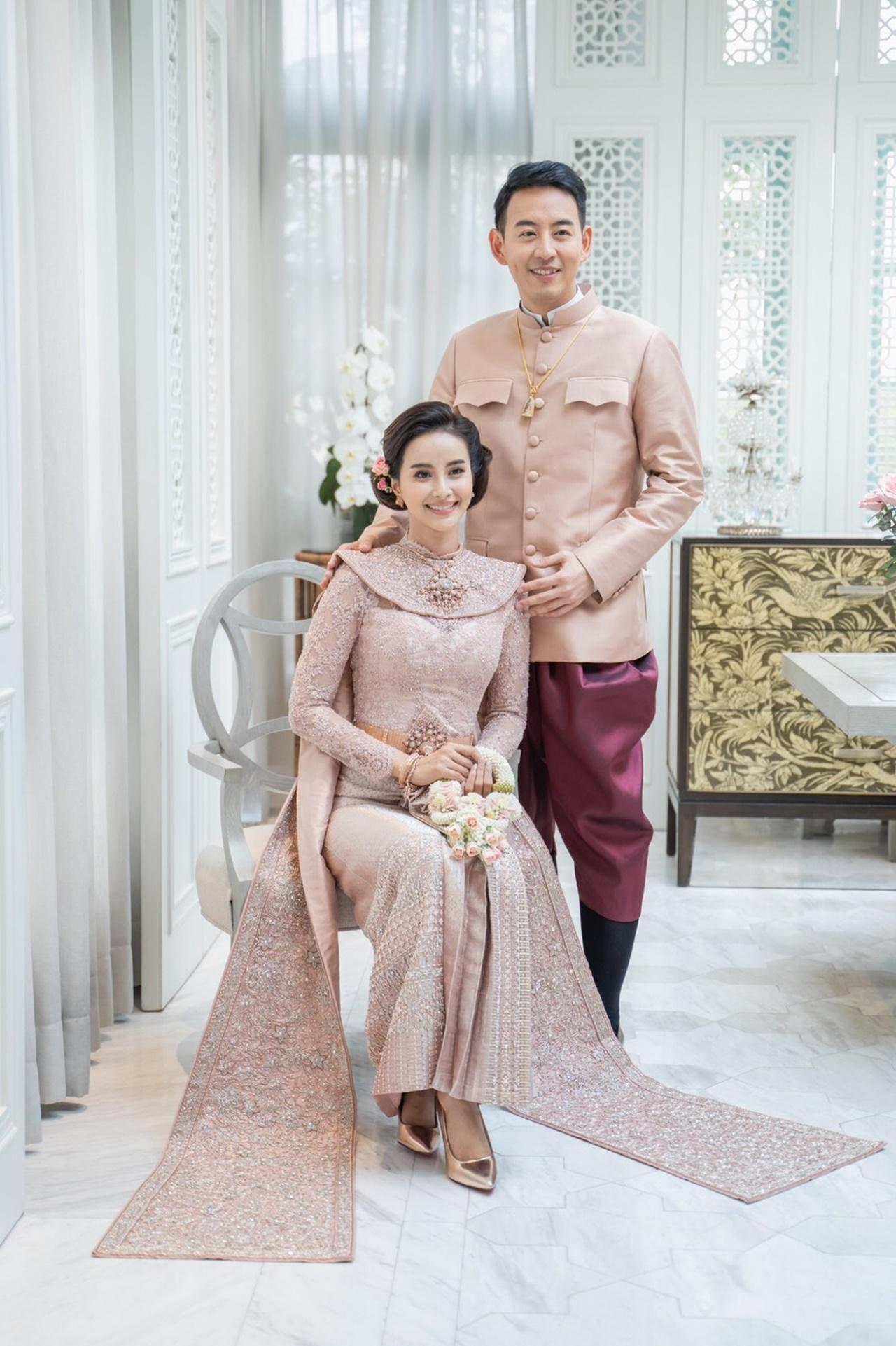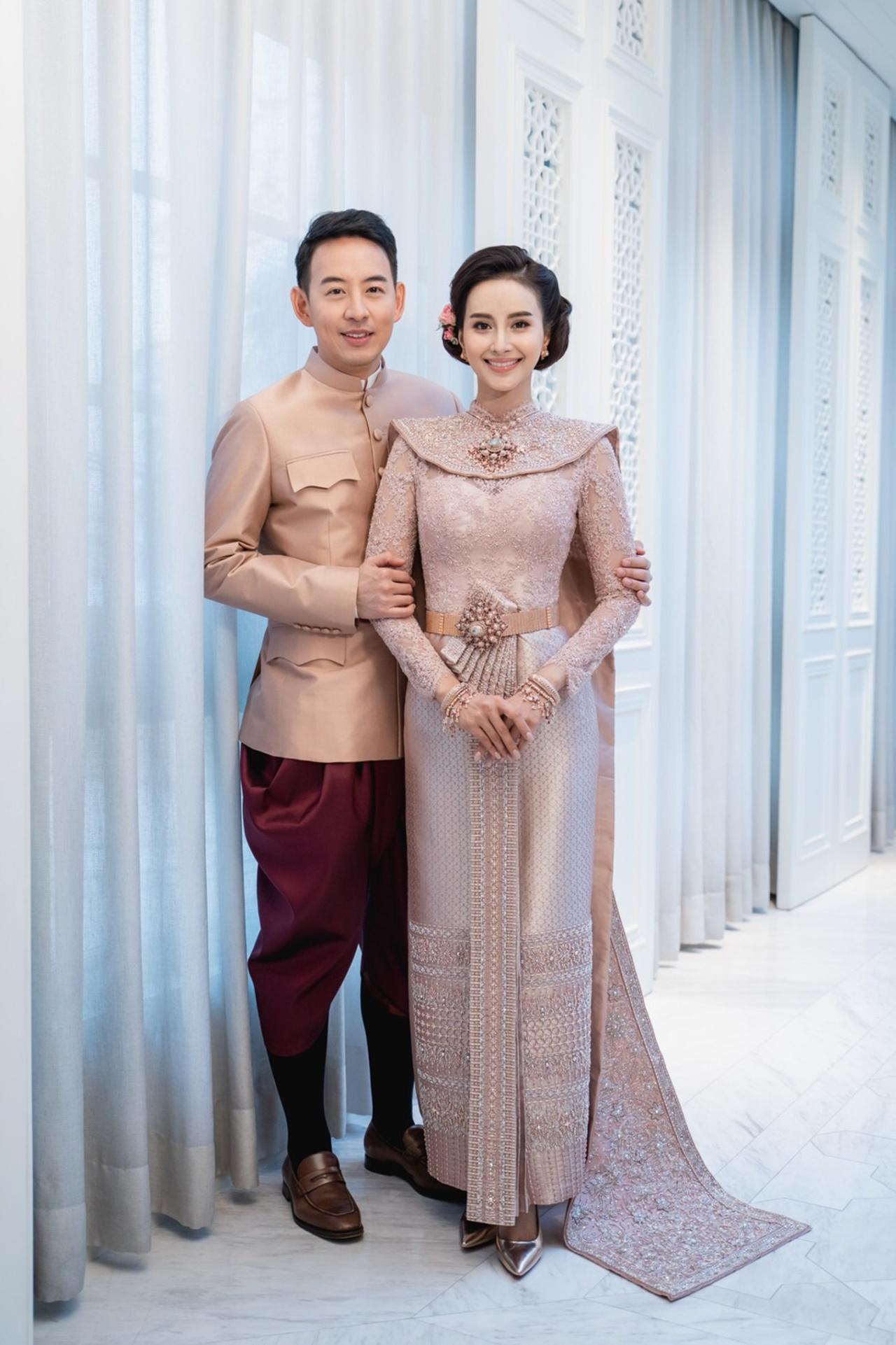 เริ่มต้นยามเช้า ด้วยพิธีหมั้นตามประเพณีไทย เปิดตัวว่าที่เจ้าสาว ด้วยชุดไทยประยุกต์ ส่วนเจ้าบ่าวสวมชุดไทยผ้าไหมพร้อมโจงกระเบนไหมไทย หลังจากเสร็จพิธีหมั้นแล้ว ก็ต่อด้วยพิธีจดทะเบียนสมรส โดยทั้งคู่ได้เชิญนายทะเบียนมาถึงที่เลย ซึ่งชุดที่สวมใส่นั้น เจ้าสาวสวมชุดไทยจักรีโทนประยุกต์ ผ้าไหมสีโอลด์โรส และเจ้าบ่าวสวมสูทผ้าไหมสีครีมและโจงกระเบนผ้าไหมลายลูกแก้วสีน้ำตาลดิ้นสีเงิน จากนั้นตามด้วยพิธียกน้ำชา ตามประเพณีจีน เจ้าสาวมาในเดรสสีขาวแขนยาวผ้าลูกไม้ฝรั่งเศส ส่วนเจ้าบ่าวนั้นสวมสูทสีเทา