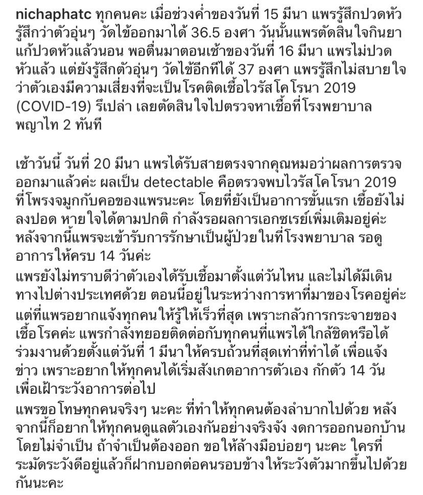 แต่ที่แพรอยากแจ้งทุกคนให้รู้ให้เร็วที่สุด เพราะกลัวการกระจายของเชื้อโรคค่ะ แพรกำลังทยอยติดต่อกับทุกคนที่แพรได้ใกล้ชิดหรือได้ร่วมงานด้วยตั้งแต่วันที่ 1 มีนาให้ครบถ้วนที่สุดเท่าที่ทำได้ เพื่อแจ้งข่าว เพราะอยากให้ทุกคนได้เริ่มสังเกตอาการตัวเอง กักตัว 14 วันเพื่อเฝ้าระวังอาการต่อไป