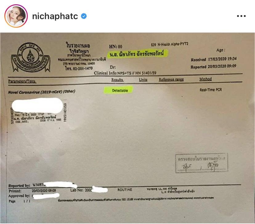 เช้าวันนี้ วันที่ 20 มีนา แพรได้รับสายตรงจากคุณหมอว่าผลการตรวจออกมาแล้วค่ะ ผลเป็น detectable คือตรวจพบไวรัสโคโรนา 2019 ที่โพรงจมูกกับคอของแพรนะคะ โดยที่ยังเป็นอาการขั้นแรก เชื้อยังไม่ลงปอด หายใจได้ตามปกติ กำลังรอผลการเอกซเรย์เพิ่มเติมอยู่ค่ะ หลังจากนี้แพรจะเข้ารับการรักษาเป็นผู้ป่วยในที่โรงพยาบาล รอดูอาการให้ครบ 14 วันค่ะ
