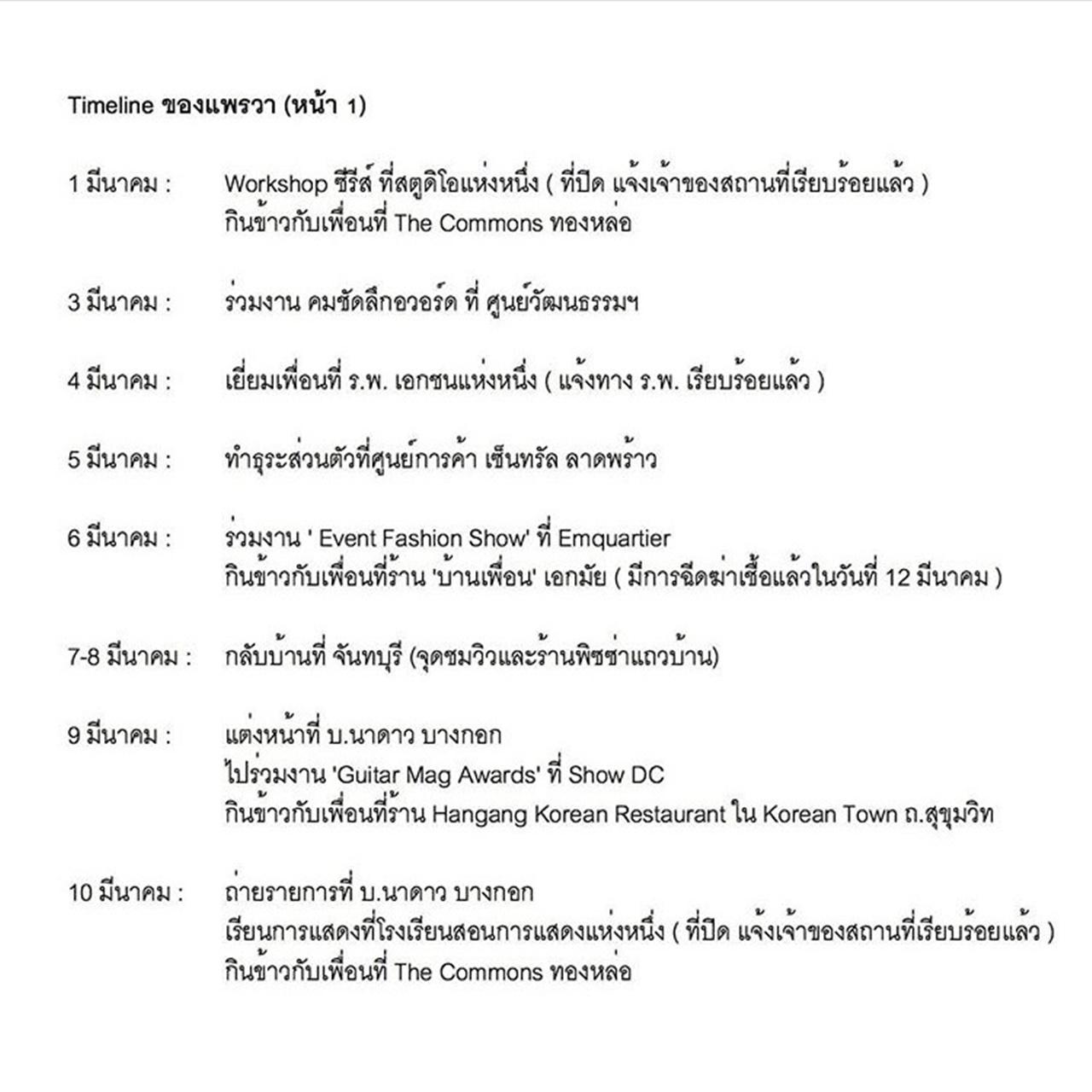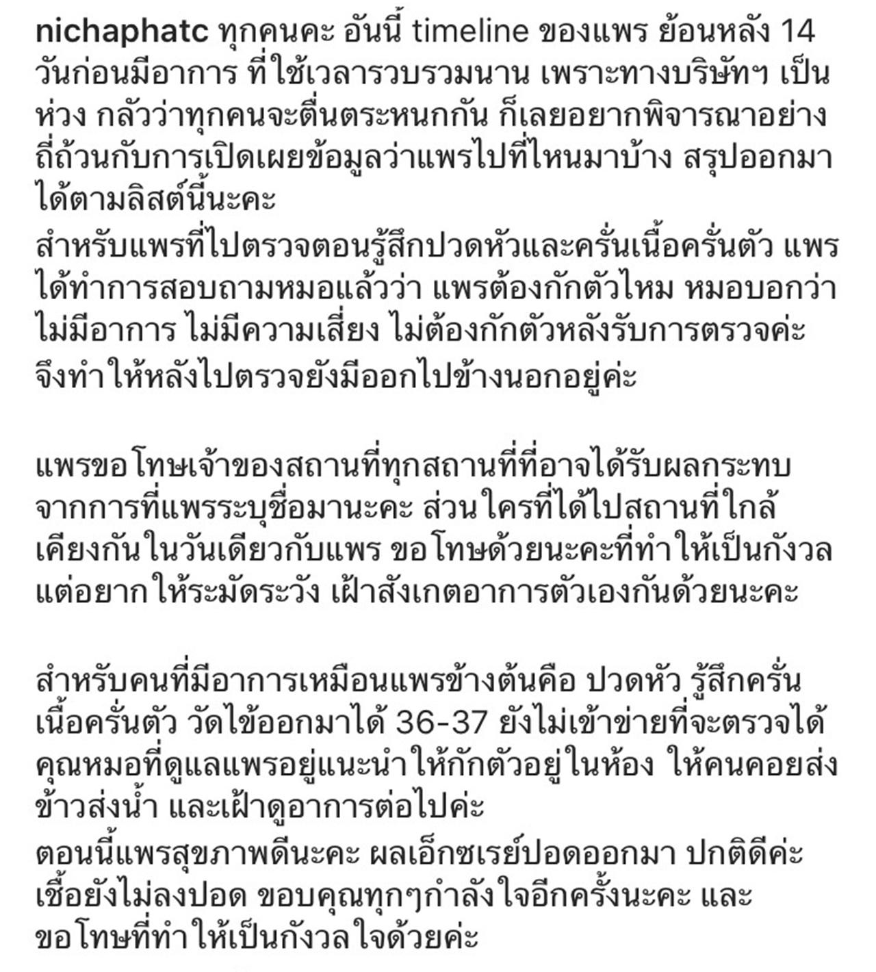 "ทุกคนคะ อันนี้ timeline ของแพร ย้อนหลัง 14 วันก่อนมีอาการ ที่ใช้เวลารวบรวมนาน เพราะทางบริษัทฯ เป็นห่วง กลัวว่าทุกคนจะตื่นตระหนกกัน ก็เลยอยากพิจารณาอย่างถี่ถ้วนกับการเปิดเผยข้อมูลว่าแพรไปที่ไหนมาบ้าง สรุปออกมาได้ตามลิสต์นี้นะคะ