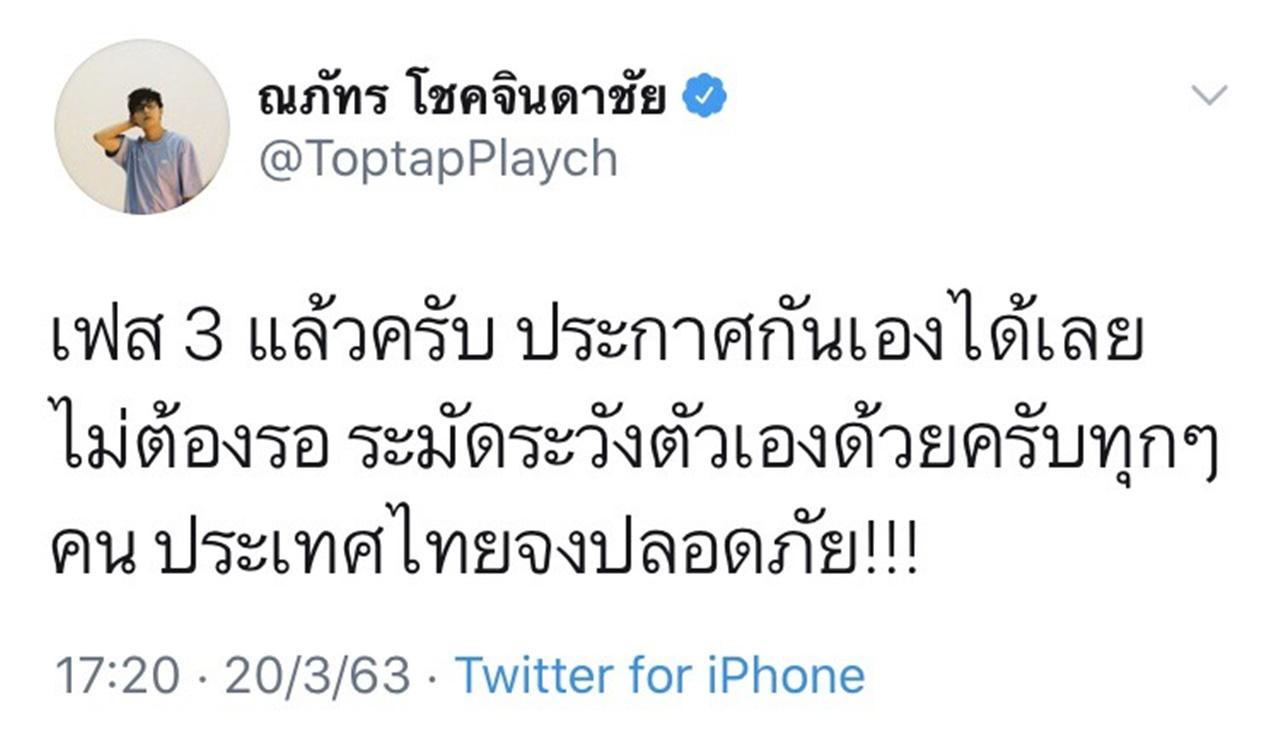 ด้าน ท็อปแท็ป ณภัทร โชคจินดาชัย ก็ได้โพสต์ข้อความผ่านทวิตเตอร์ โดยบอกว่า ตอนนี้เราเข้าเฟส 3 ของโรคโควิด-19 แล้ว ให้ประกาศกันได้เลย และให้ทุกคนระมัดระวังตัวเองด้วย