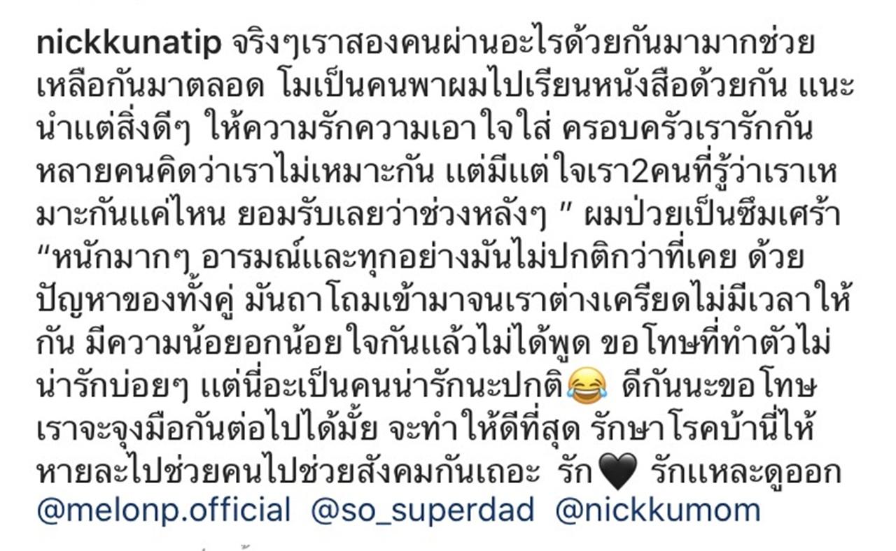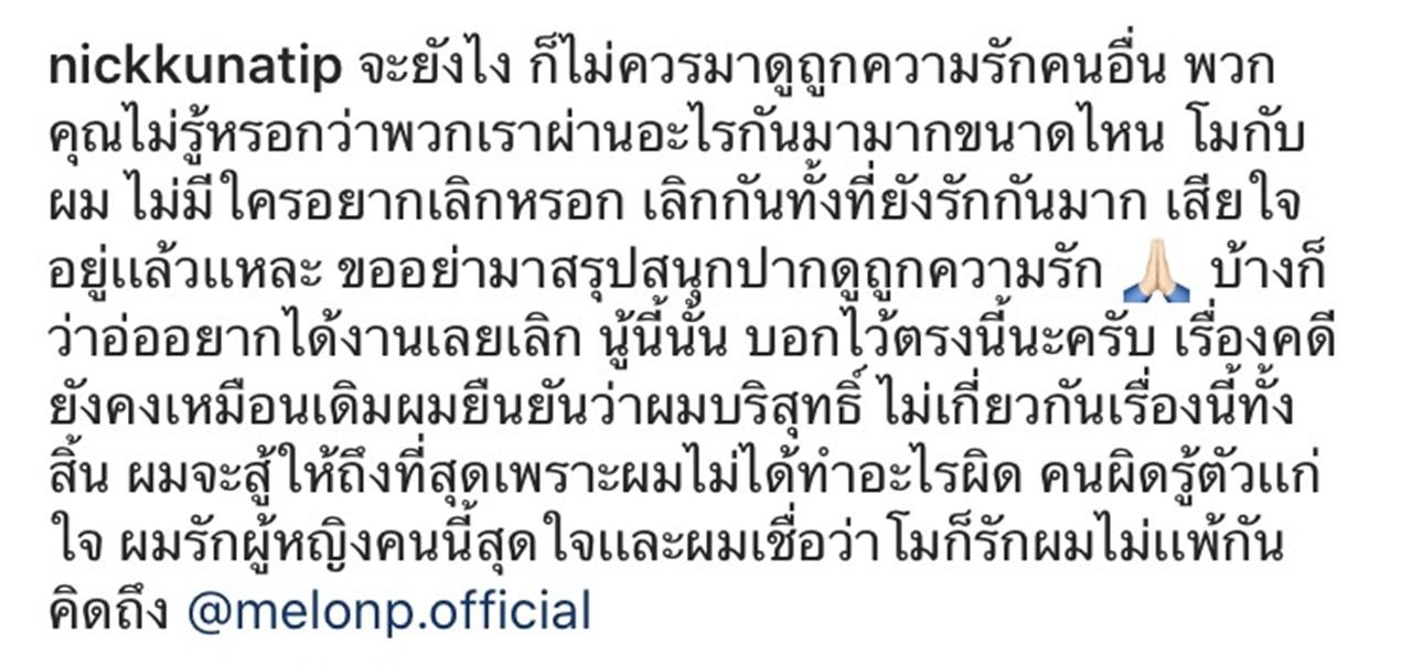 บอกไว้ตรงนี้นะครับ เรื่องคดียังคงเหมือนเดิมผมยืนยันว่าผมบริสุทธิ์ ไม่เกี่ยวกันเรื่องนี้ทั้งสิ้น ผมจะสู้ให้ถึงที่สุดเพราะผมไม่ได้ทำอะไรผิด คนผิดรู้ตัวเเก่ใจ ผมรักผู้หญิงคนนี้สุดใจเเละผมเชื่อว่าโมก็รักผมไม่เเพ้กัน คิดถึง @melonp.official"