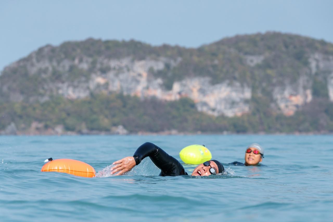 มาถึงการว่ายน้ำในช่วงบ่ายของวัน โตโน่และทีมตั้งใจว่ายให้ไปถึง เกาะส้ม โดยเมื่อถึงเกาะส้ม โตโน่ ได้ขึ้นเกาะ ซึ่งมีชาวบ้านในพื้นที่มาคอยให้กำลังใจ