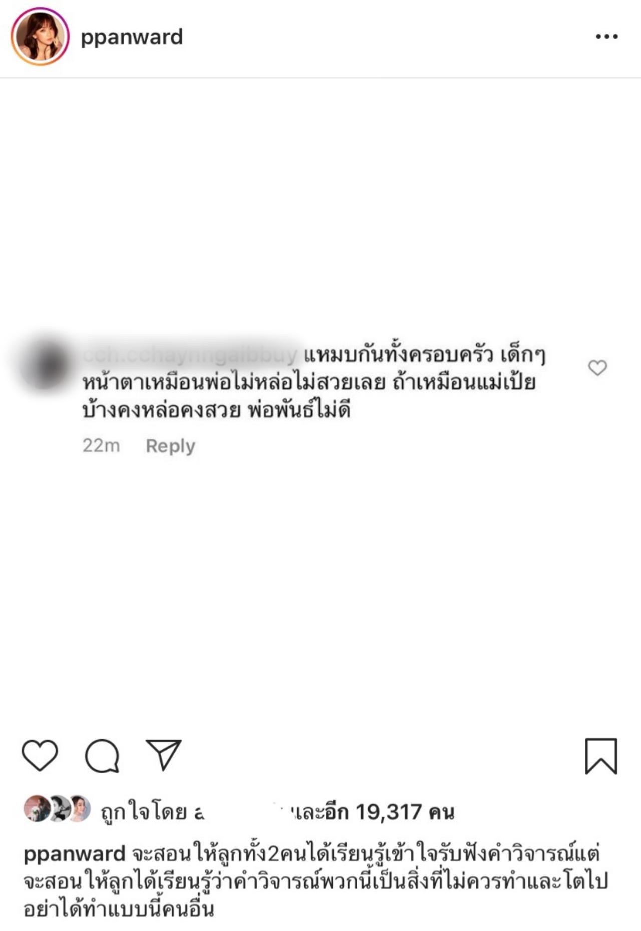 ทำเอาคุณแม่ลูกสองคนสวยถึงกับเดือดปรี๊ด เมื่อเจอชาวเน็ตคอมเมนต์แรง จนสาวเป้ยต้องขอแคปข้อความดังกล่าวมาโพสต์ประจานในอินสตาแกรมของตัวเอง โดยชาวเน็ตคนดังกล่าวได้คอมเมนต์ว่า “แหมบกันทั้งครอบครัว เด็กๆ หน้าตาเหมือนพ่อ ไม่หล่อไม่สวยเลย ถ้าเหมือนแม่เป้ยบ้างคงหล่อคงสวย พ่อพันธุ์ไม่ดี”