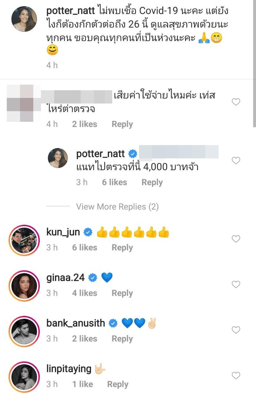 ล่าสุด แนท อนิพรณ์ ได้เผยผลตรวจโควิด-19 ของตัวเอง คือ Undetectable ซึ่งแปลว่าไม่พบเชื้อ พร้อมทั้งเขียนข้อความว่า “ไม่พบเชื้อ Covid-19 นะคะ แต่ยังไงก็ต้องกักตัวต่อถึง 26 นี้ ดูแลสุขภาพด้วยนะทุกคน ขอบคุณทุกคนที่เป็นห่วงนะคะ”