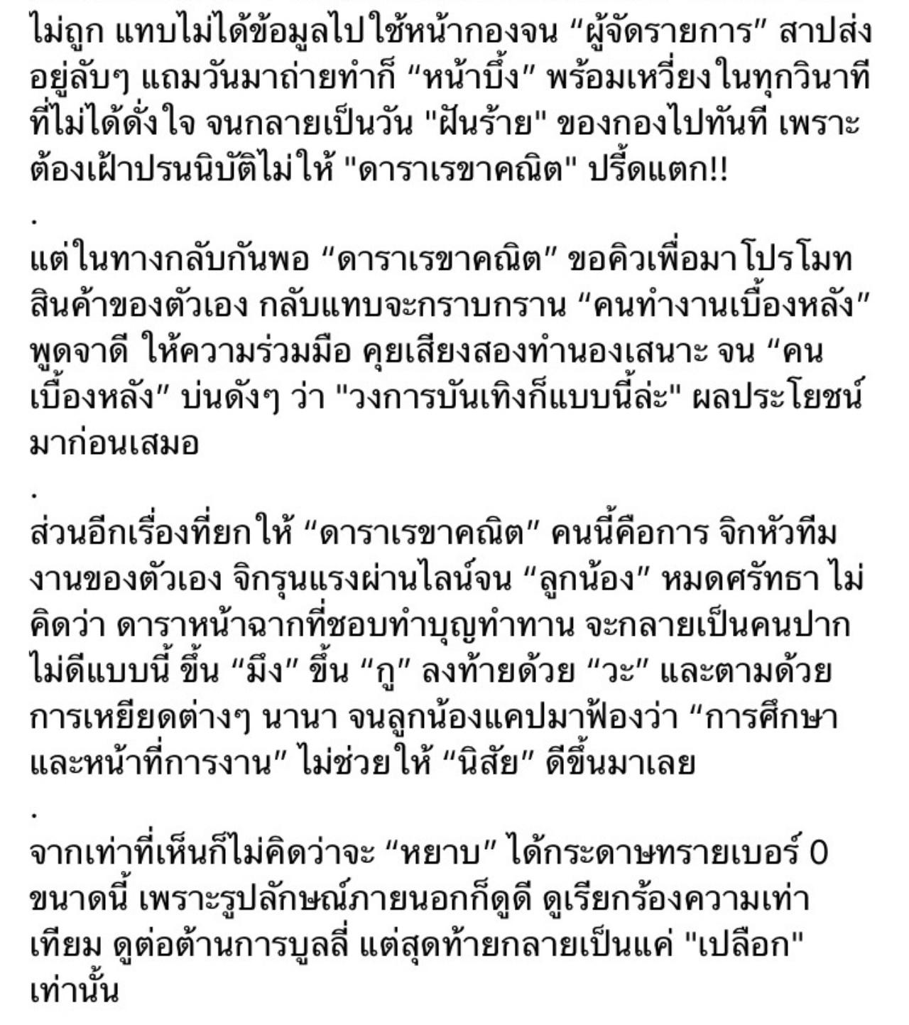 ส่วนอีกเรื่องที่ยกให้ “ดาราเรขาคณิต” คนนี้คือการจิกหัวทีมงานของตัวเอง จิกรุนแรงผ่านไลน์จน “ลูกน้อง” หมดศรัทธา ไม่คิดว่า ดาราหน้าฉากที่ชอบทำบุญทำทาน จะกลายเป็นคนปากไม่ดีแบบนี้ ขึ้น “มึง” ขึ้น “กู” ลงท้ายด้วย “วะ” และตามด้วยการเหยียดต่างๆ นานา จนลูกน้องแคปมาฟ้องว่า “การศึกษาและหน้าที่การงาน” ไม่ช่วยให้ “นิสัย” ดีขึ้นมาเลย