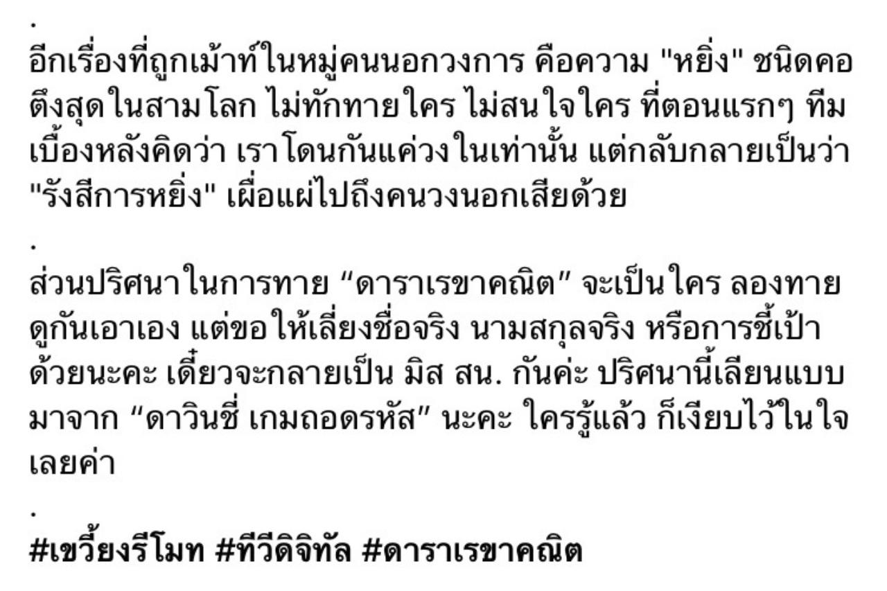 ส่วนปริศนาในการทาย “ดาราเรขาคณิต” จะเป็นใคร ลองทายดูกันเอาเอง แต่ขอให้เลี่ยงชื่อจริง นามสกุลจริง หรือการชี้เป้าด้วยนะคะ เดี๋ยวจะกลายเป็น มิส สน. กันค่ะ ปริศนานี้เลียนแบบมาจาก “ดาวินชี่ เกมถอดรหัส” นะคะ ใครรู้แล้ว ก็เงียบไว้ในใจเลยค่า #เขวี้ยงรีโมท #ทีวีดิจิทัล #ดาราเรขาคณิต"